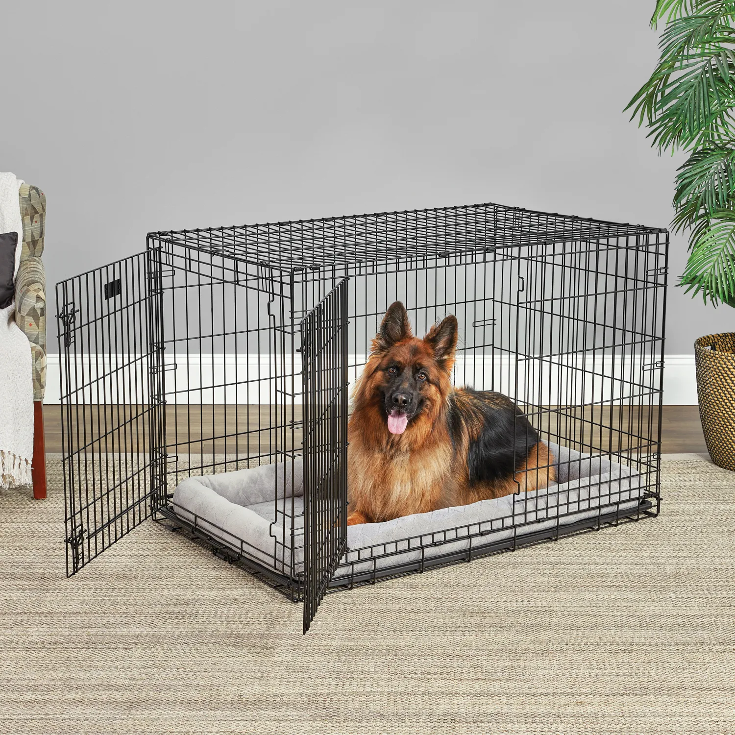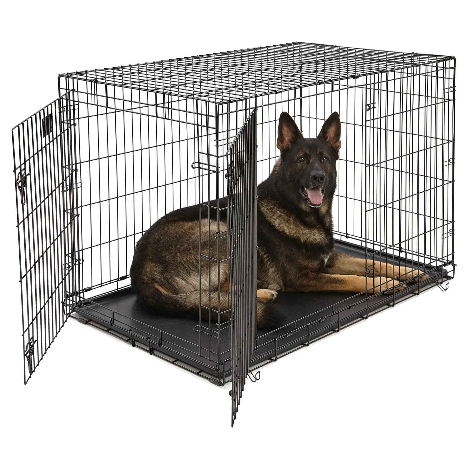 Устойчивая, крепкая клетка выполнена из качественного металла, обработана долговечным черным покрытием Electro-Coat, обеспечивает безопасность животного и хозяина. Двери расположены на смежных боковых сторонах. Удобный, крепкий двойной замок-задвижка позволяет закрыть клетку как снаружи, так и изнутри. В комплект включены: разделяющая панель, пластиковый поддон и специальные пластиковые ручки для удобной транспортировки клетки в сложенном виде. Закругленная угловая защита клетки обеспечивает безопасность питомцам и людям и не повреждает поверхность, на которой размещается. Разделяющая панель позволяет создавать универсальные отсеки. Поддон из композитного пластика легко моется. Клетка легко устанавливается и складывается без использования инструментов. В сложенном виде занимает мало места.