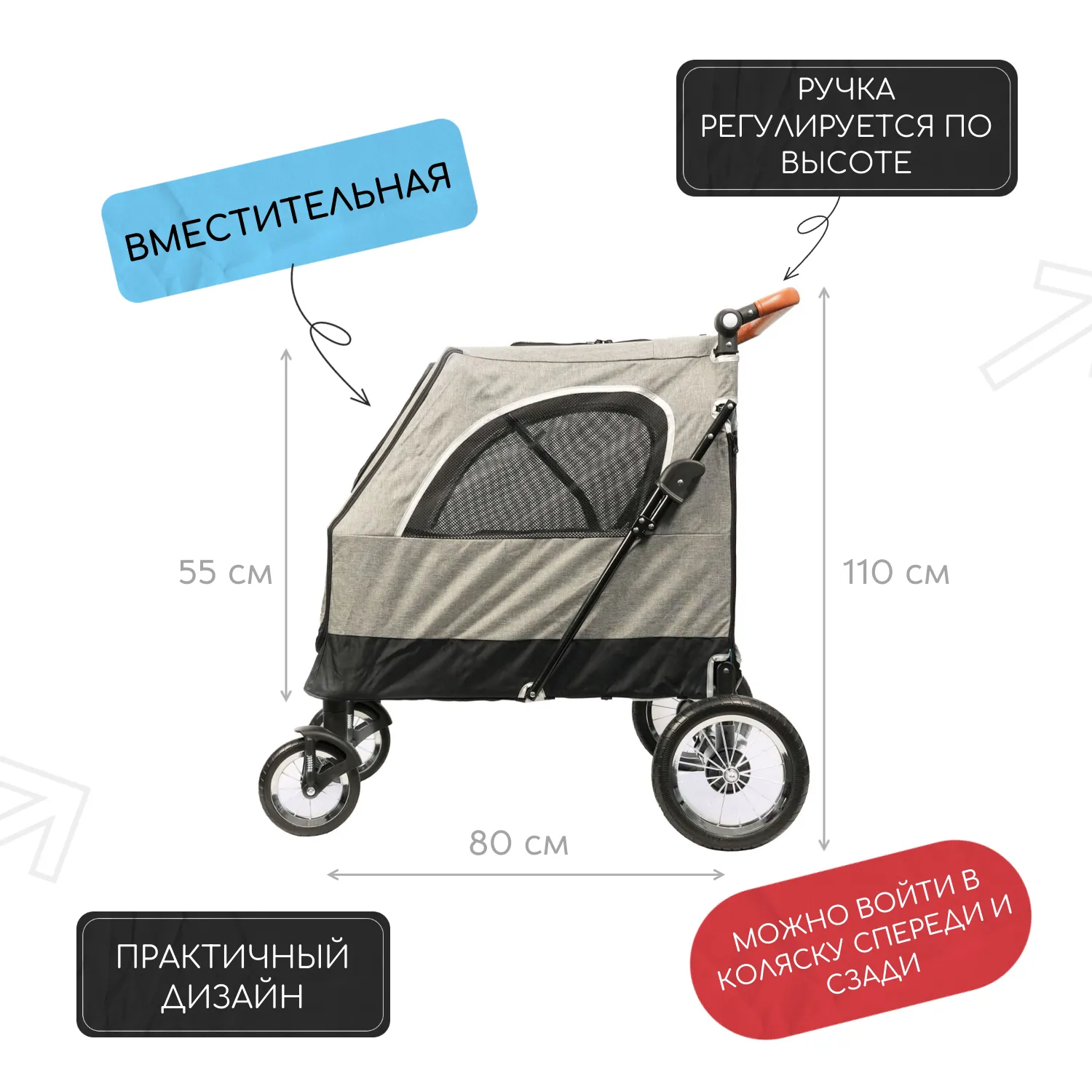 Также аксессуар незаменим для крупных и средних собак. Несмотря на габариты, коляска достаточно маневренная благодаря поворотному механизму на передних колесах. Стальная рама на устойчивом шасси удержит питомцев весом до 55 килограмм. Большие задние колеса снабжены системой торможения одним нажатием. Эргономичная ручка удобно регулируется по положению и высоте. В коляску возможно залезть и сзади, и спереди: на коляске предусмотрены просторные окошки. Внутри предусмотрен ремень безопасности для питомца. Под коляской есть плоский кармашек для хранения вещей.