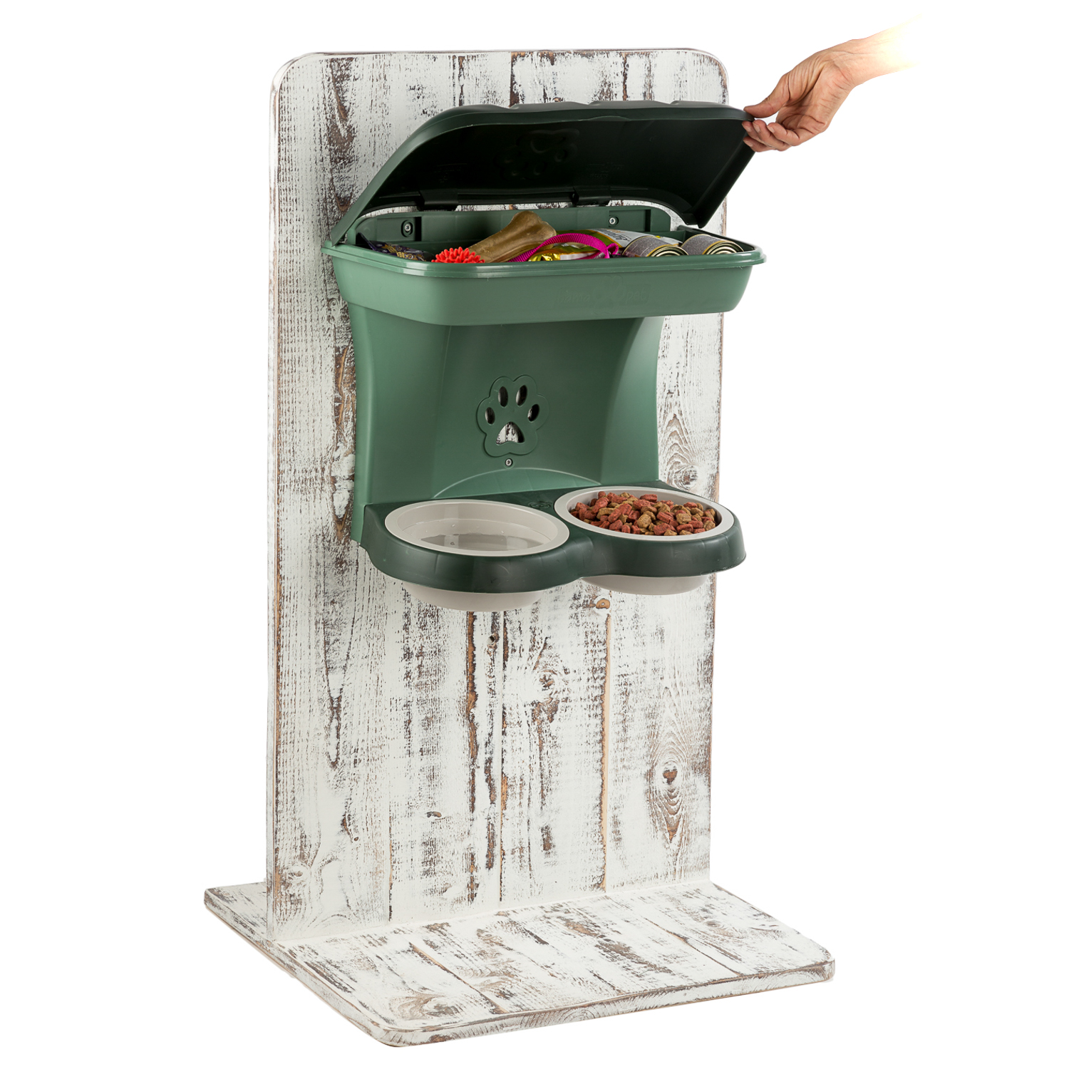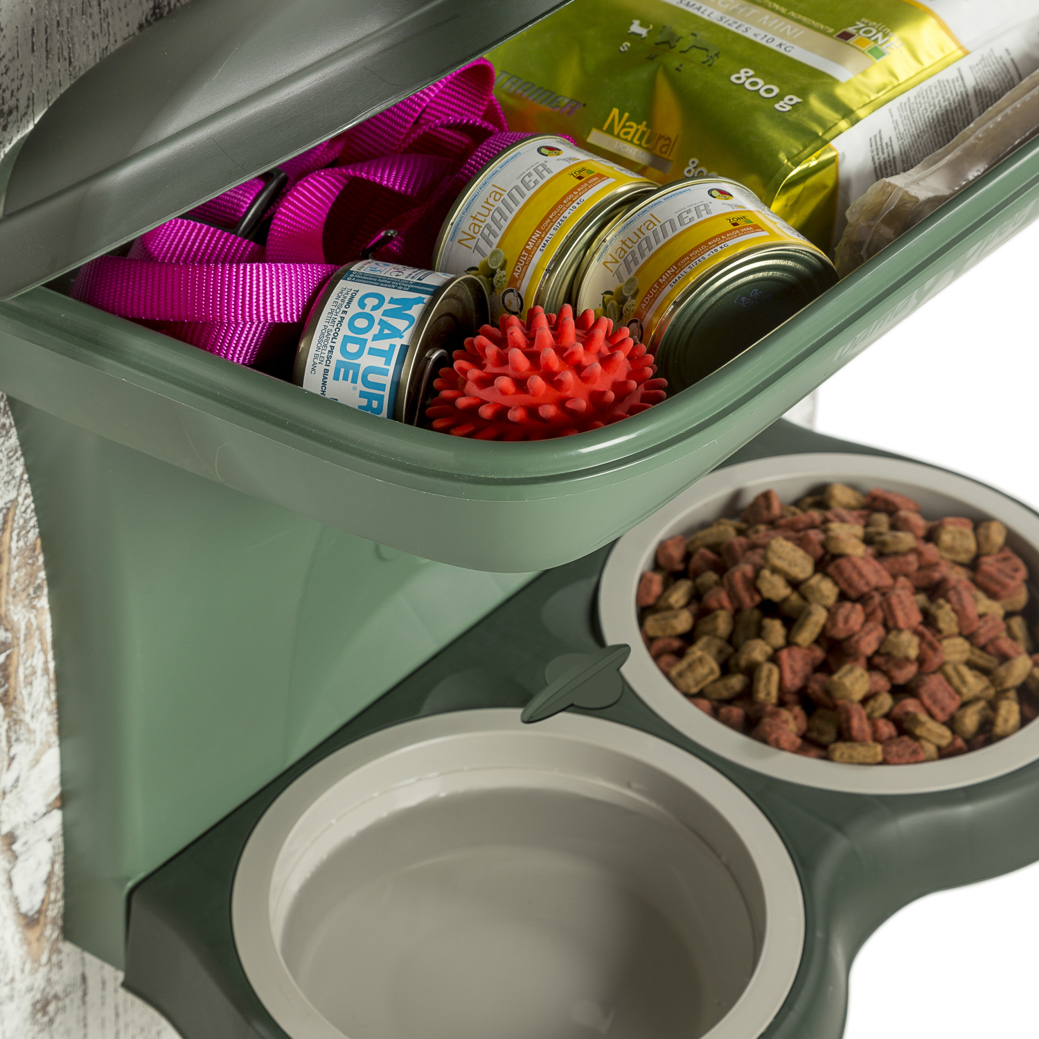 В функциональной подвесной миске также есть контейнер, где можно хранить игрушки и лакомства.