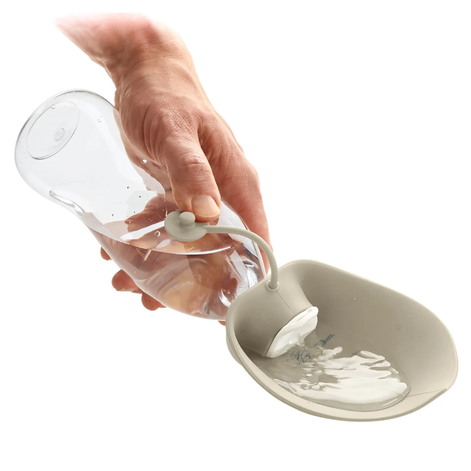 Походная поилка для собак изготовлена из пищевого пластика и силиконовой чаши.
