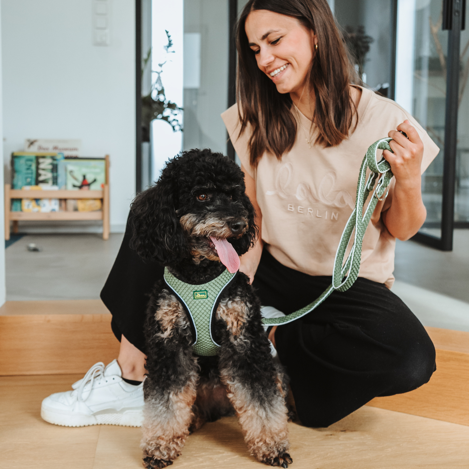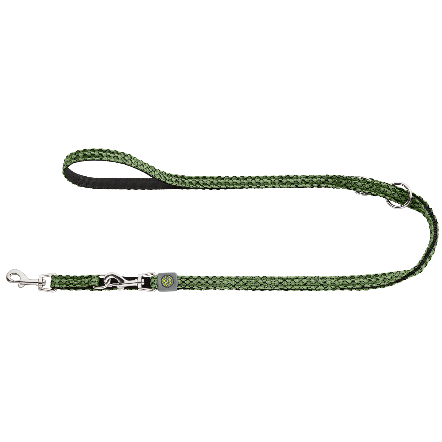 Благодаря второму карабину (вместо ручки) и 3 кольцам поводок можно по-разному комбинировать и изменять длину поводка.
