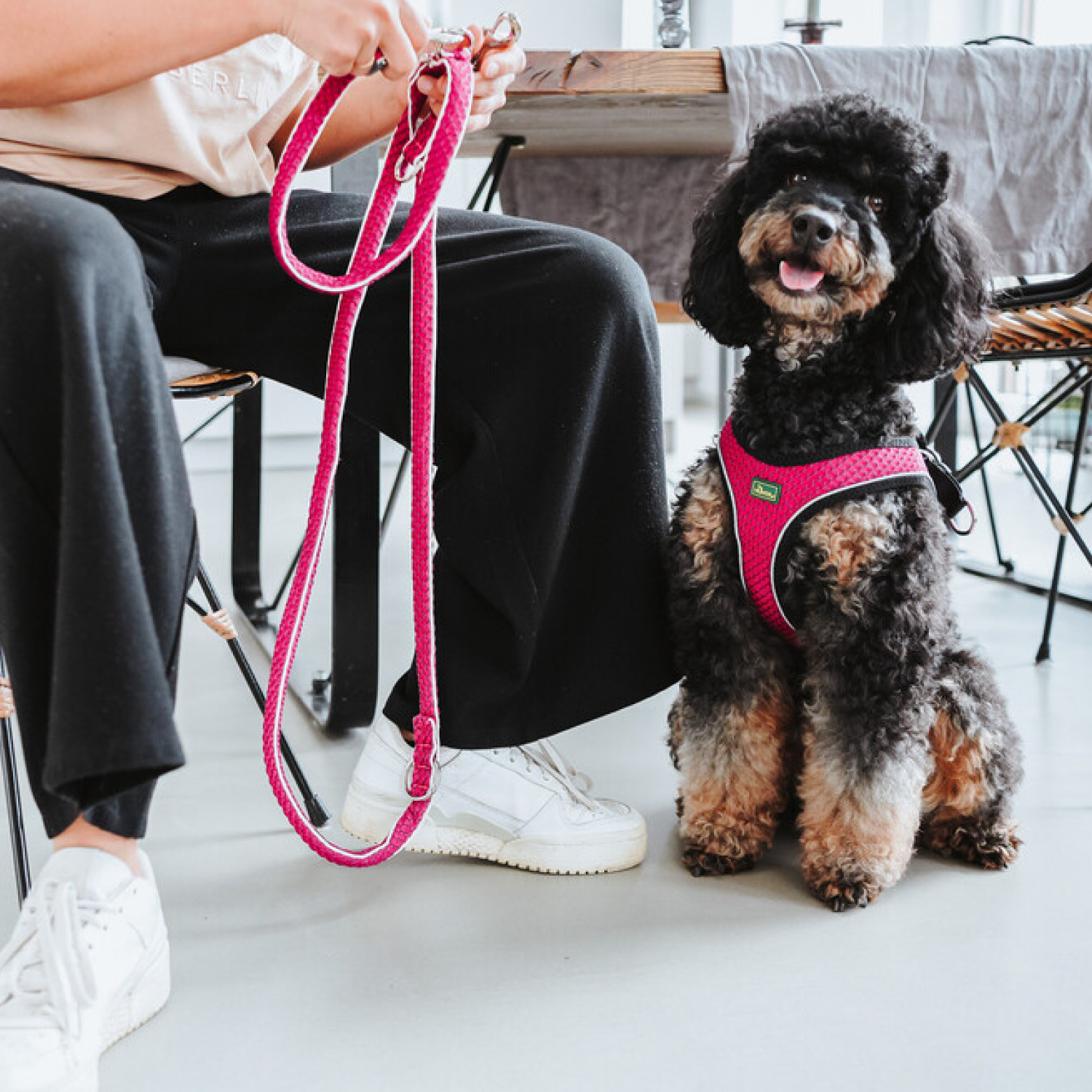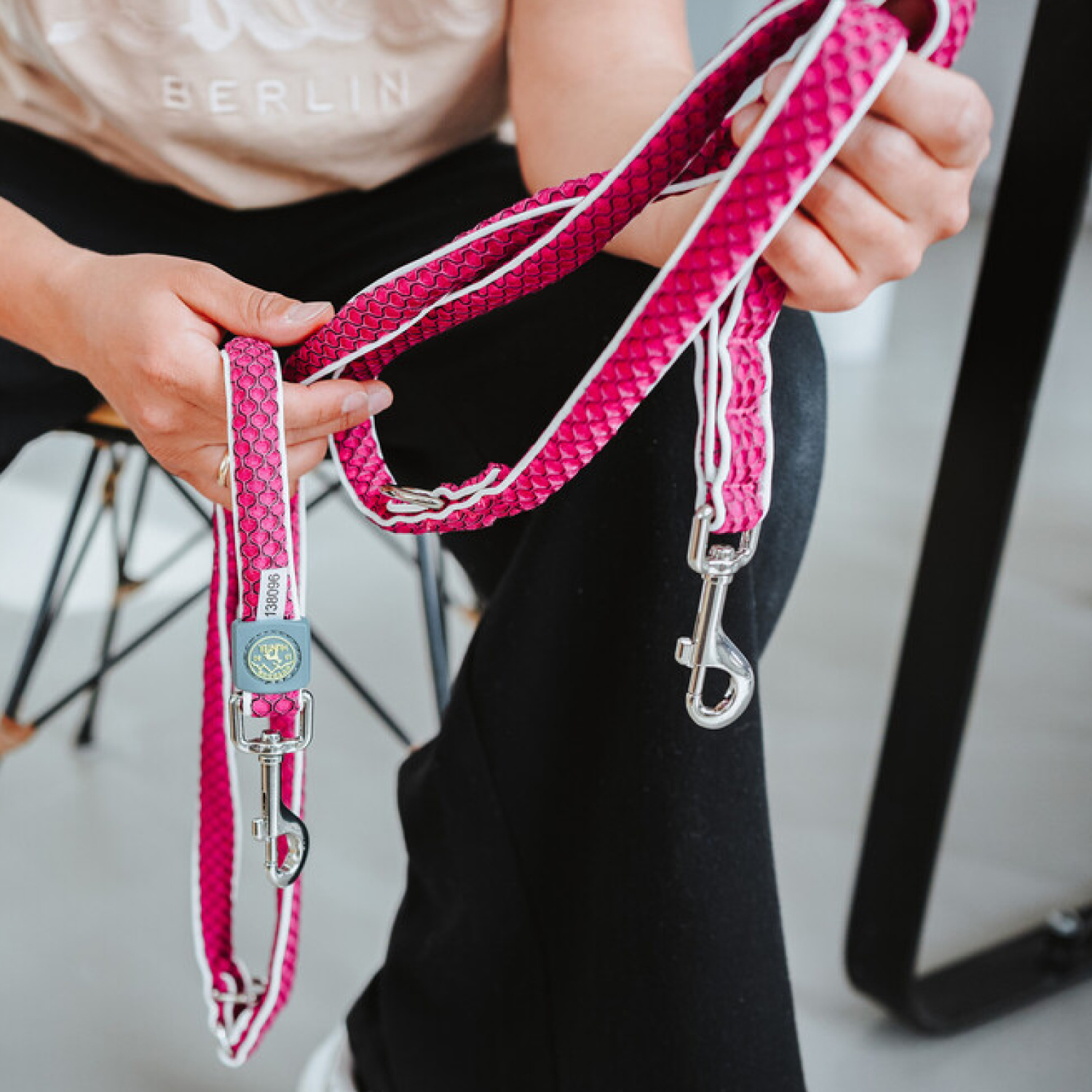 Благодаря второму карабину (вместо ручки) и 3 кольцам поводок можно по-разному комбинировать и изменять длину поводка.