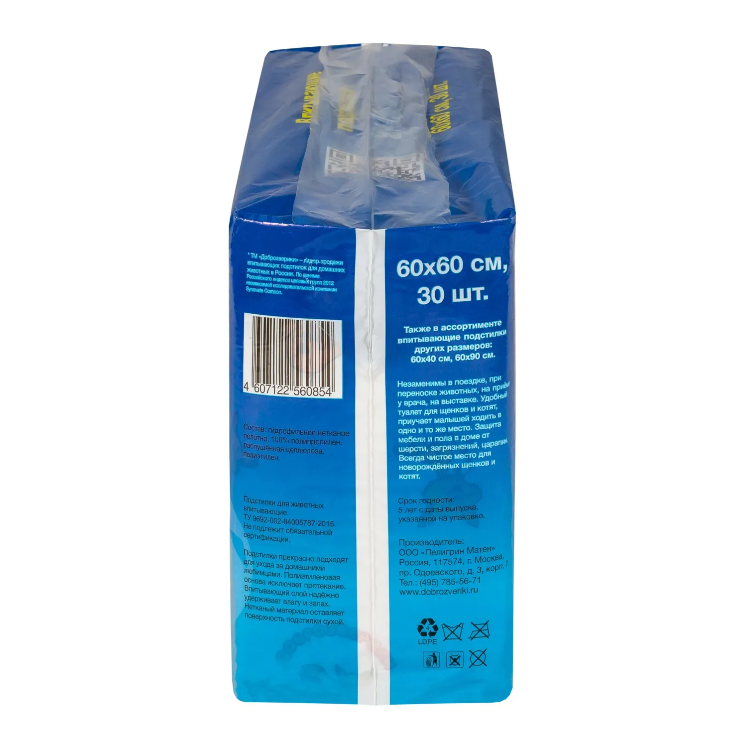 Показания: для ухода за домашними животными. Полиэтиленовое основание исключает протекание жидкости, нетканый материал оставляет поверхность сухой, а впитывающий слой надёжно удерживает влагу и запах.