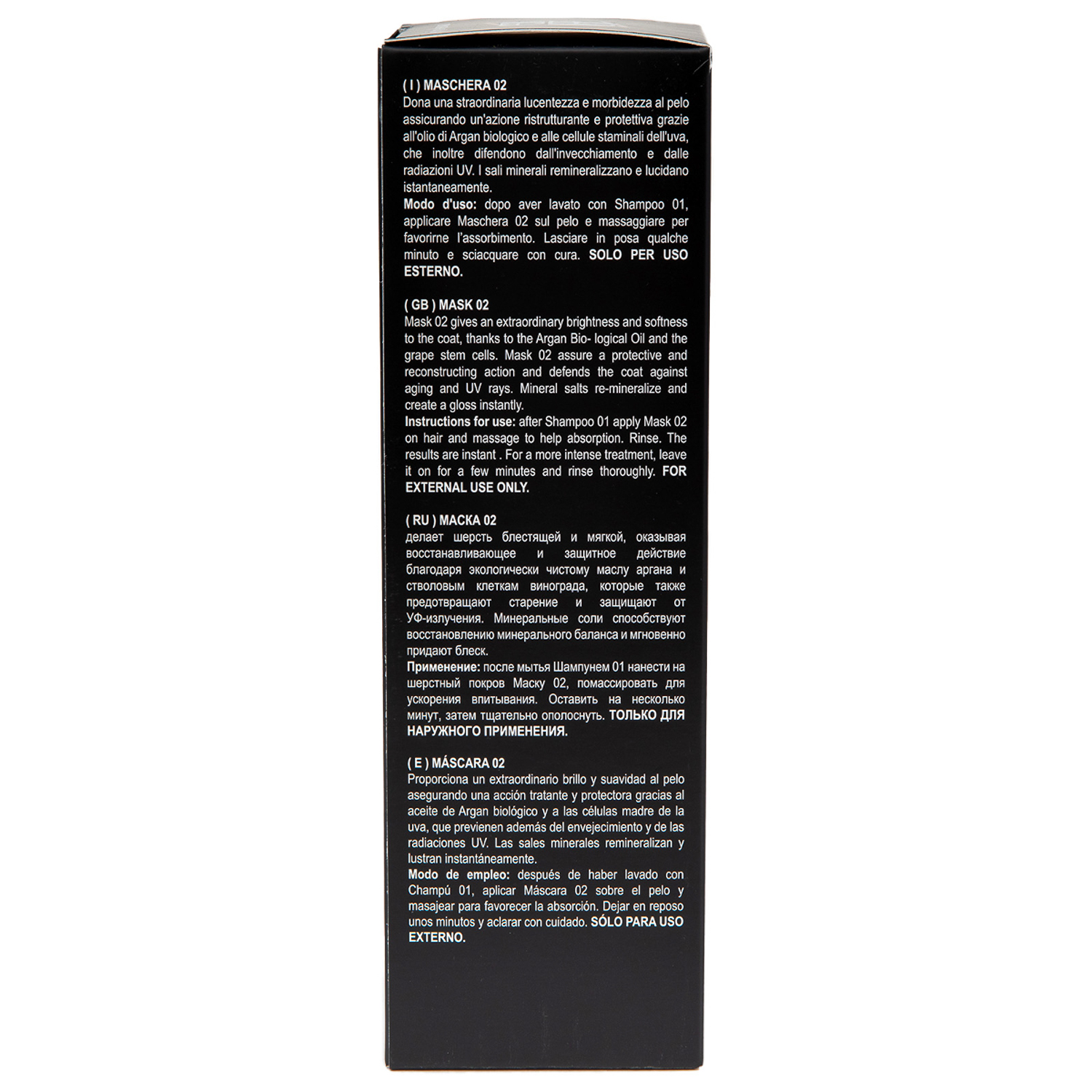Применение: после мытья шампунем 01 нанести на шерстный покров маску 02, помассировать для ускорения впитывания. Оставить на несколько минут, затем тщательно ополоснуть.