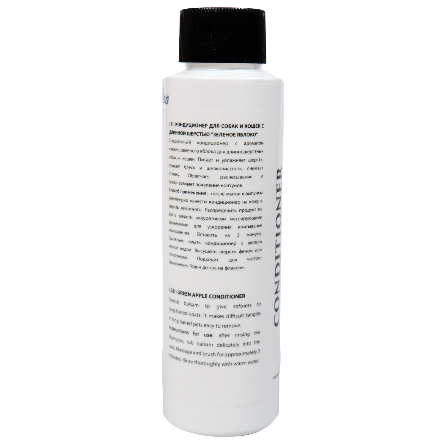 Специальный кондиционер, придающий мягкость и блеск длинношерстным покровам. Кондиционер с ароматом зеленого яблока облегчает расчесывание и распутывание колтунов у длинношерстных животных.