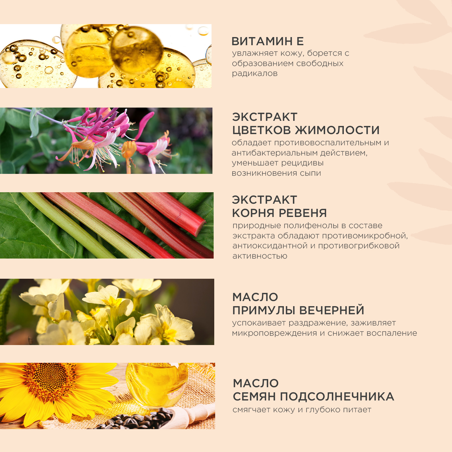 Экстракт корня ревеня пальчатого (Rheum palmatum) , экстракт цветков жимолости японской (Lonicera japonica) , масло примулы вечерней (Primula officinalis), масло семян подсолнечника (Helianthus annuus) , Церамид NP , аллантоин –, токоферол; в качестве вспомогательных: ароматизатор «Жимолость и травы», сорбитан олеат, гидроксид натрия , полиглицерил-10 пентаолеат, ксантановая камедь , пропиленгликоль, глицерин , денат спирта , Динатрий EDTA , феноксиэтанол , сорбат калия , бензилбензоат, хлорид магния, полисорбат 80, диэтилгексилсульфосукцинат натрия, вода.Ингредиенты