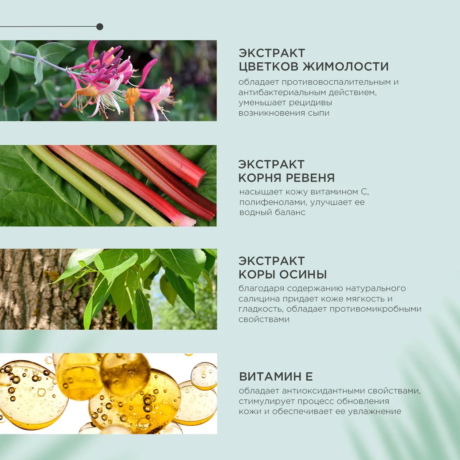 - Экстракт цветков жимолости: обладает противовоспалительным и антибактериальным действием, уменьшает рецидивы возникновения сыпи
