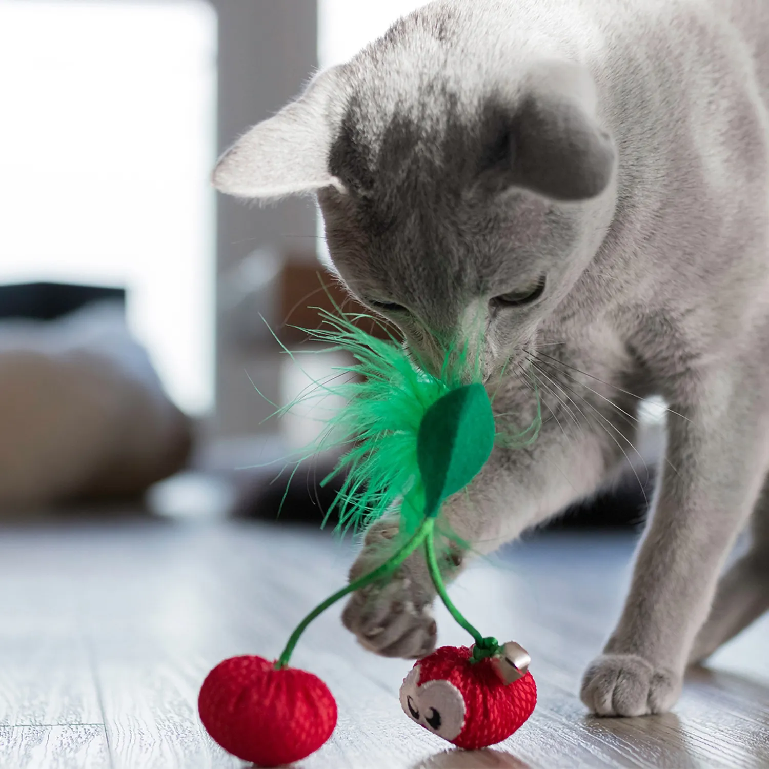 Вишни издают хрустящий звук при сжимании, дополнительно стимулируя интерес кошки к игре.
