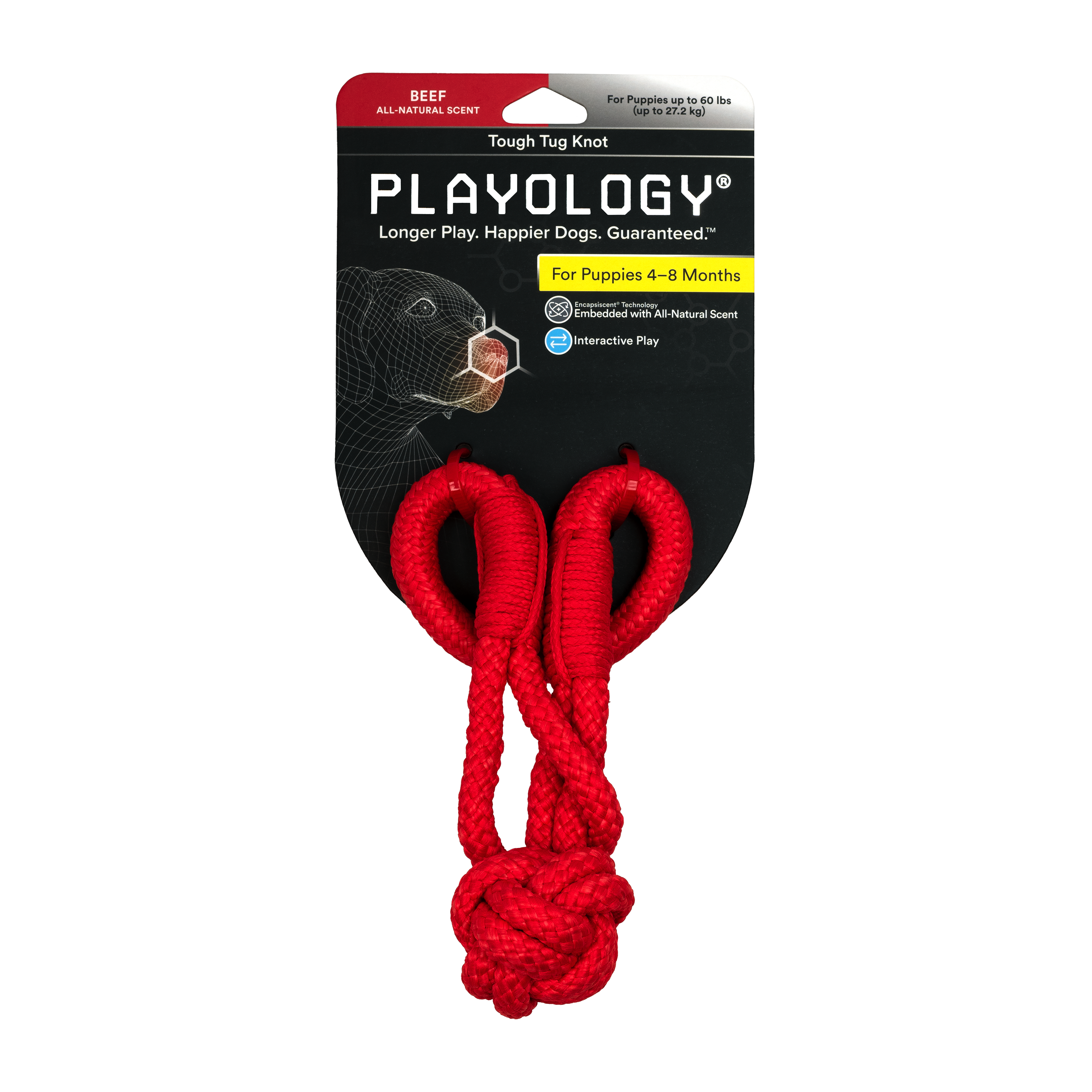 Playology ® разрабатывает ароматизированные игрушки, изготовленные из безопасных для собак материалов, которые занимают собаку в 7 раз дольше, чем игрушка без запаха. В основу каждой игрушки заложена технология «вживленного аромата» (ENCAPSISCENT®), ароматизированные частицы по запатентованной формуле буквально внедрены на микроскопическом уровне в прочный материал игрушек, будь то резина или текстиль, что делает их абсолютно уникальными и долго сохраняющими аромат. Канат Tough Tug Knot изготовлен по технологии формованного волокна, предотвращающей разрыв веревки на длинные куски, которые могут быть опасны для вашего питомца при проглатывании. Конструкция каната с узелками идеально подходит для щенков и помогает в развитии. Подходит для щенков 4-8 месяцев (весом до 27,2 кг) в период прорезывания зубов для интерактивных игр.