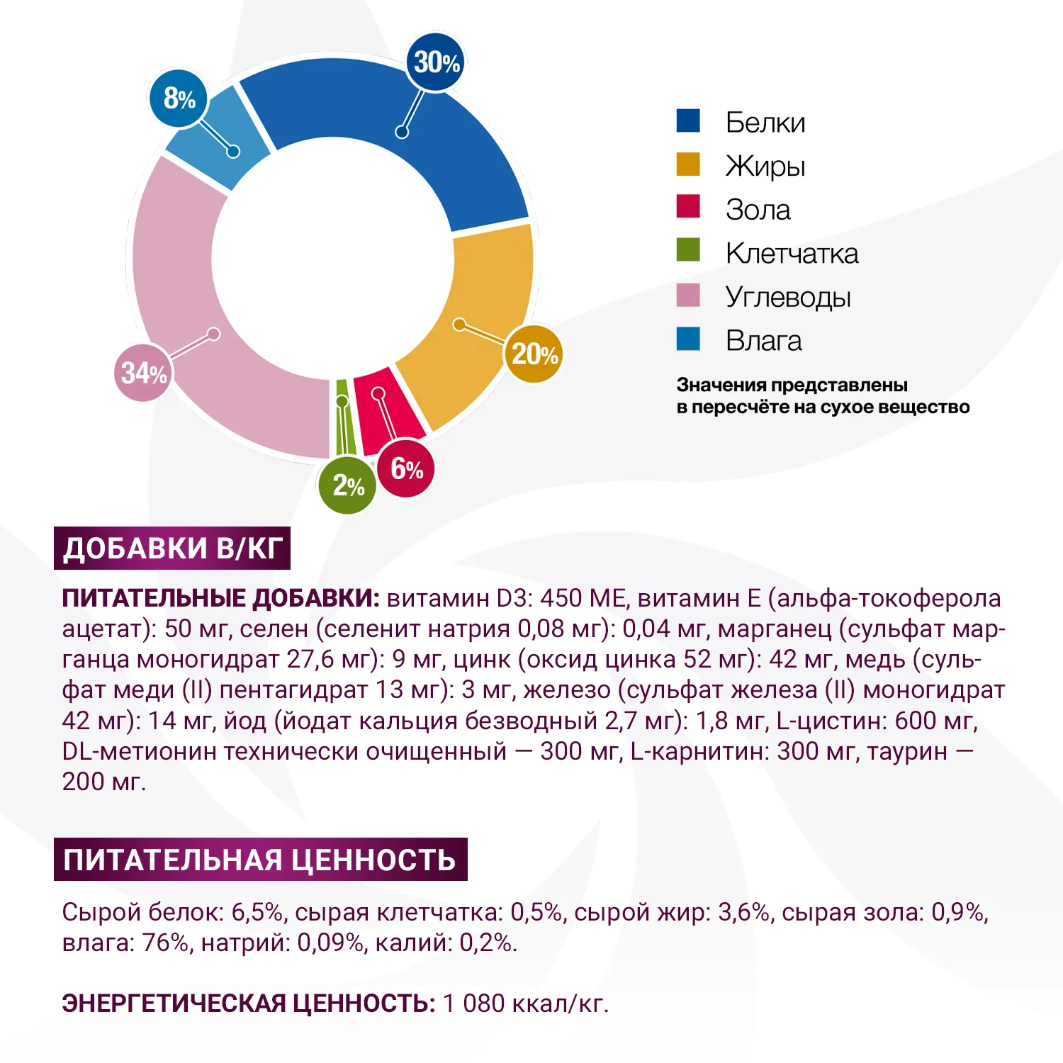 Куриная печень 20%, мясо свинины, картофель, сухое яйцо 4%, тапиока, животный жир (свиной жир очищенный на 99,5%), рыбий жир (лососевое масло очищенное на 99,5%), минеральные вещества, гидролизованный животный белок, гидролизованные дрожжи 1% (из которых свободные нуклеотиды мин.44%), семена подорожника (0,5%), ксилоолигосахариды 0,4%, волокна гороха, сушёный конский каштан (0,06%). Легко усваиваемые ингредиенты: куриная печень и яйцо. Источник гелеобразующих веществ: семена подорожника.Питательная ценность: сырой белок 9,7%, сырая клетчатка 0,3%, сырой жир 5,5%, сырая зола 2%, влага 75%, натрий 0,1%, калий 0,5%.
