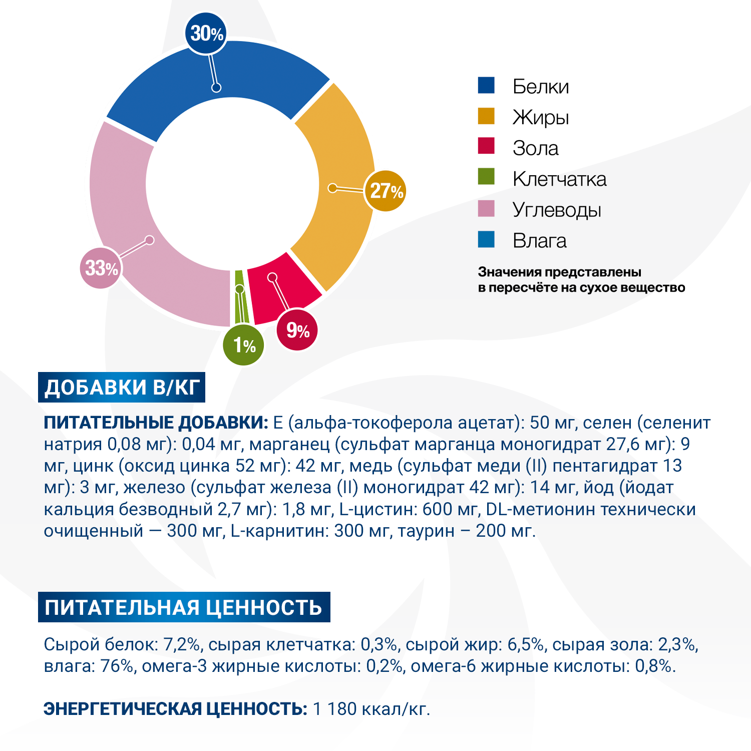 Питательная ценность: сырой белок 7,2%, сырая клетчатка 0,3%, сырой жир 6,5%, сырая зола 2,3%, влага 76%, омега-3 жирные кислоты 0,2%, омега-6 жирные кислоты 0,8%.