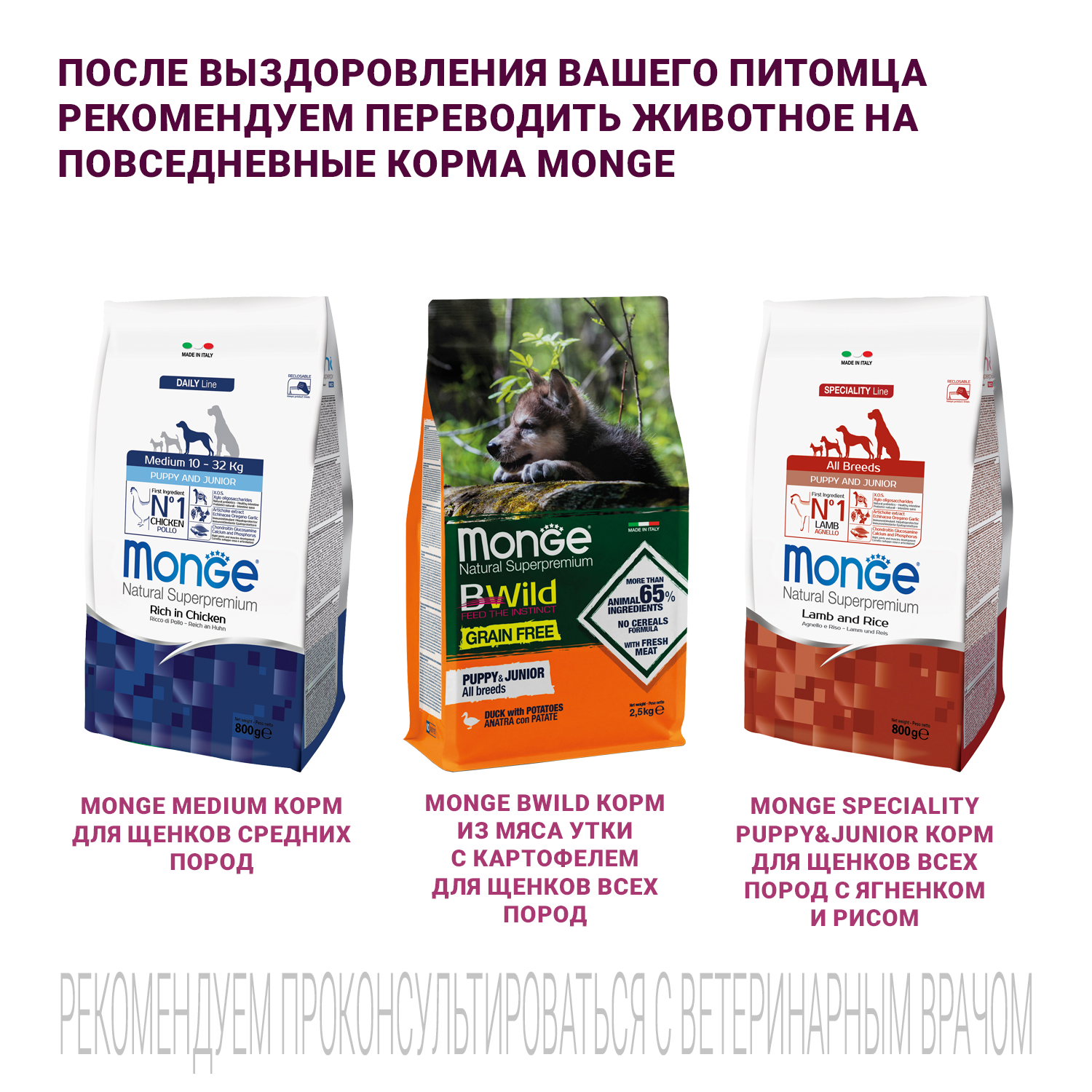 Лечебный корм Monge VetSolution Dog Gastrointestinal для собак Гастроинтестинал при заболеваниях желудочно-кишечного тракта, таких как острый и хронический гастрит, расстройства моторики желудка энтерит и воспалительные заболевания кишечника, энтеропатии с потерей белка, синдром короткой кишки и избыточный бактериальный рост в тонком отделе кишечника, колит, а так же при остром и хроническом панкреатите (для собак, НЕ страдающих ожирением и гипертриглицеридемией).