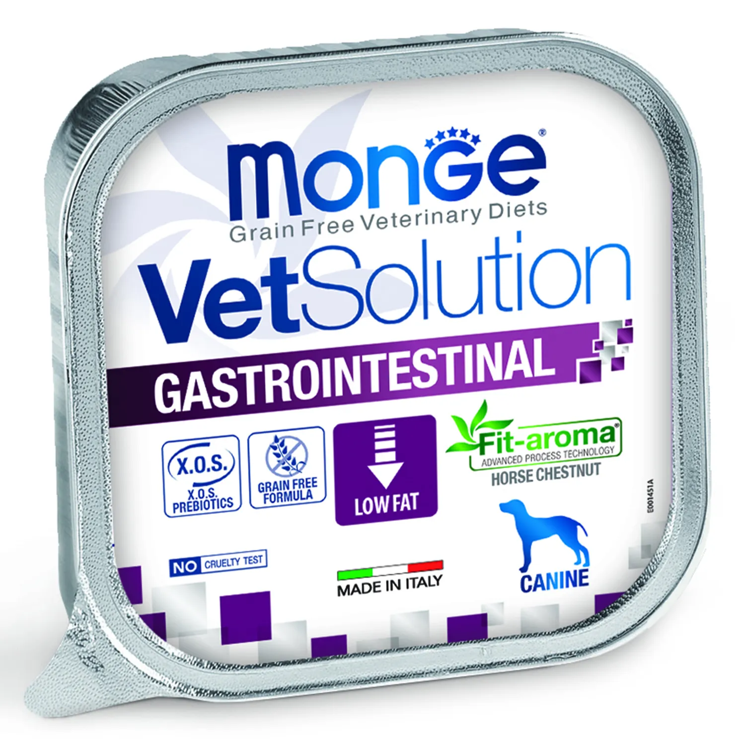 Лечебный корм Monge VetSolution Dog Gastrointestinal Гастроинтестинал для собак при заболеваниях желудочно-кишечного тракта, таких как острый и хронический гастрит, расстройства моторики желудка энтерит и воспалительные заболевания кишечника, энтеропатии с потерей белка, синдром короткой кишки и избыточный бактериальный рост в тонком отделе кишечника, колит, а так же при остром и хроническом панкреатите (для собак, НЕ страдающих ожирением и гипертриглицеридемией) 150 г.