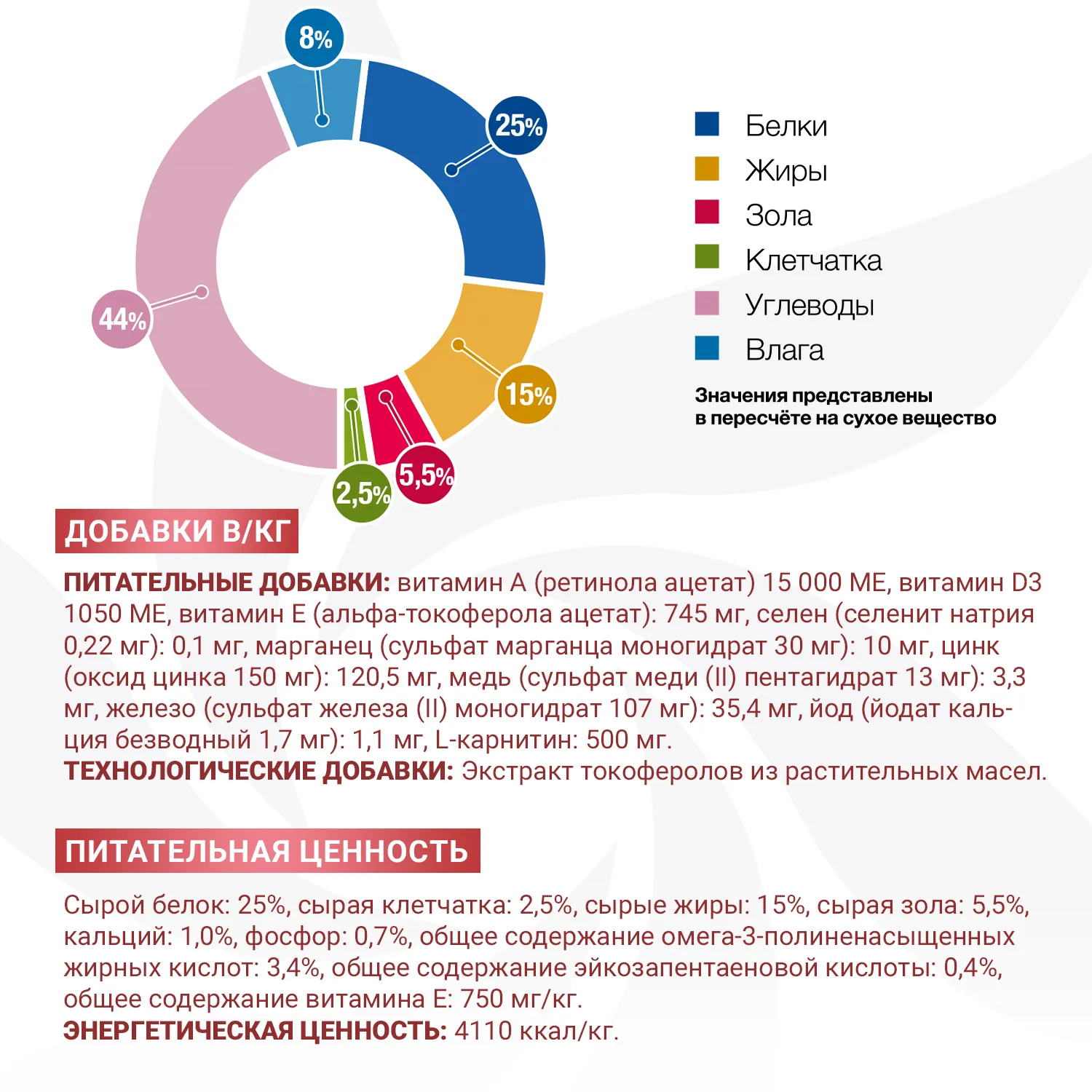 сырой белок 25%, сырая клетчатка 2,5%, сырые жиры 15%, сырая зола 5,5%, кальций 1,0%, фосфор 0,7%, общее содержание жирных омега-3 кислот 3,4%, общее содержание эйкозапентаеновой кислоты 0,4%, общее содержание витамина E 750 мг/кг.