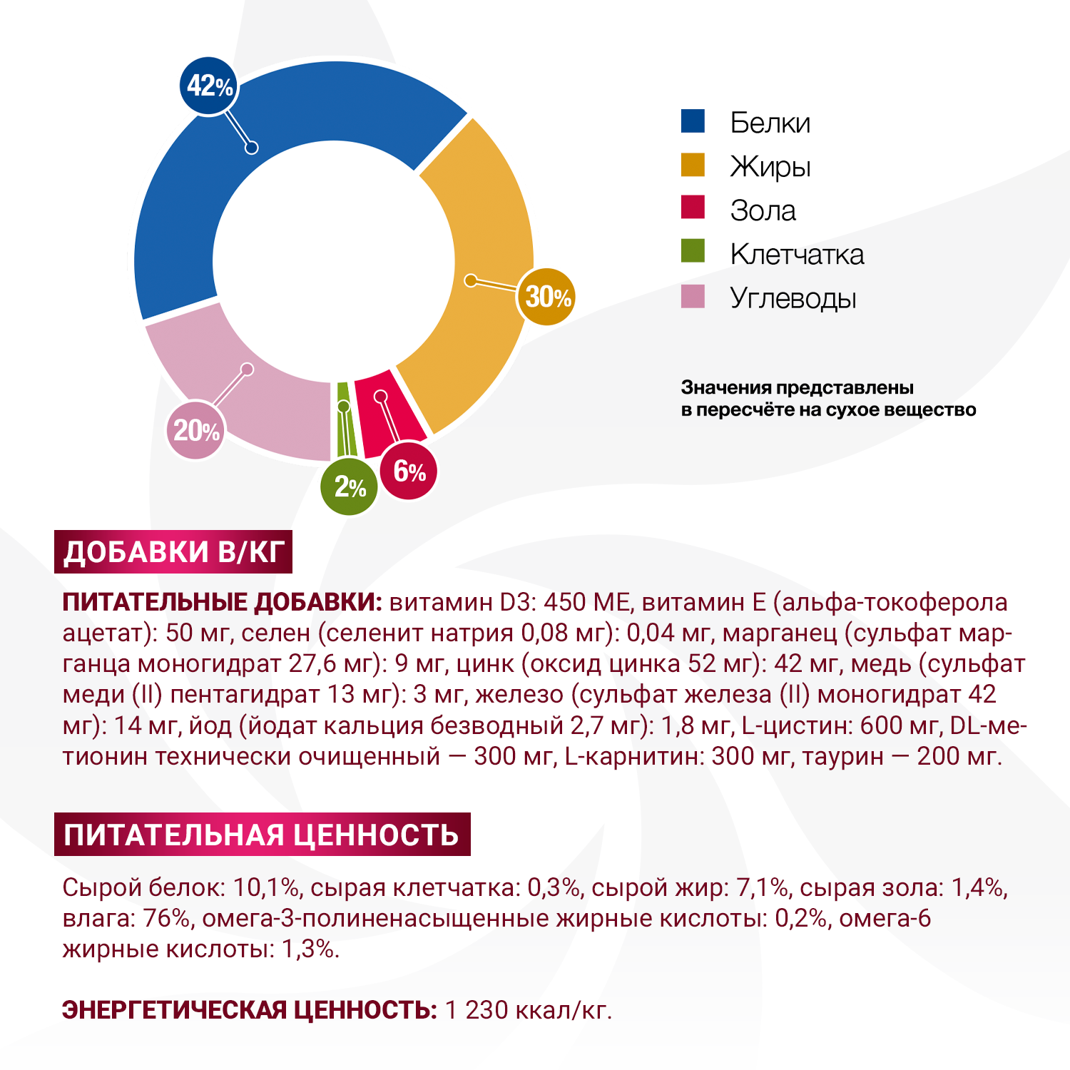 Питательные добавки на кг: витамин D3: 450 МЕ, витамин Е (альфа-токоферола ацетат): 50 мг, селен (селенит натрия 0,08 мг): 0,04 мг, марганец (сульфат марганца моногидрат 27,6 мг): 9 мг, цинк (оксид цинка 52 мг): 42 мг, медь (сульфат меди (II) пентагидрат 13 мг): 3 мг, железо (сульфат железа (II) моногидрат 42 мг): 14 мг, йод (йодат кальция безводный 2,7 мг): 1,8 мг, L-цистин: 600 мг, DL-метионин технически чистый - 300 мг, L-карнитин: 300 мг, таурин – 200 мг.
