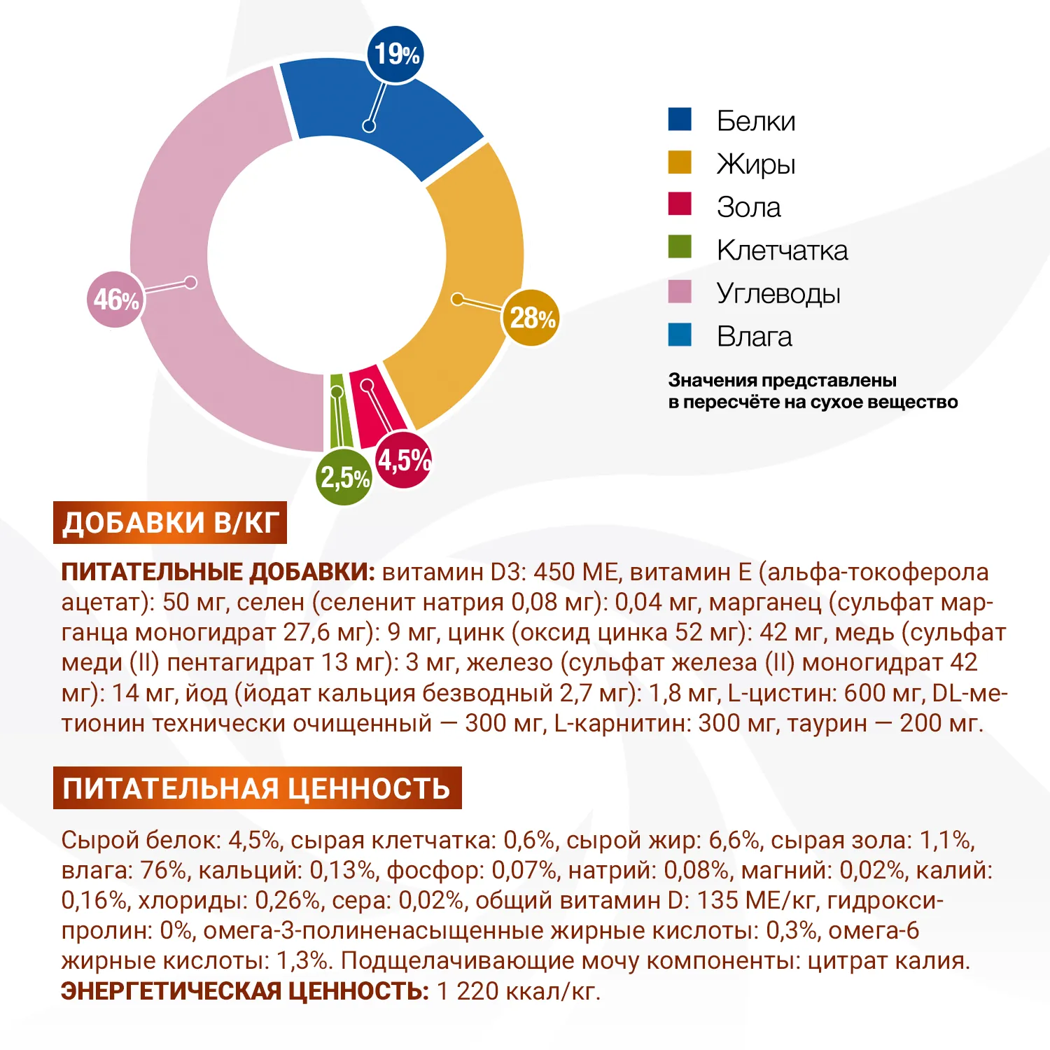 Подщелачивающие мочу компоненты: цитрат калия. Энергетическая ценность: 122 ккал/кг.