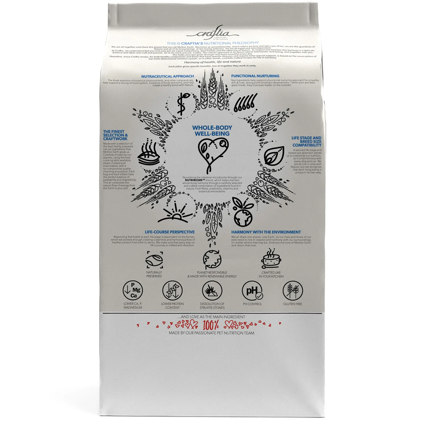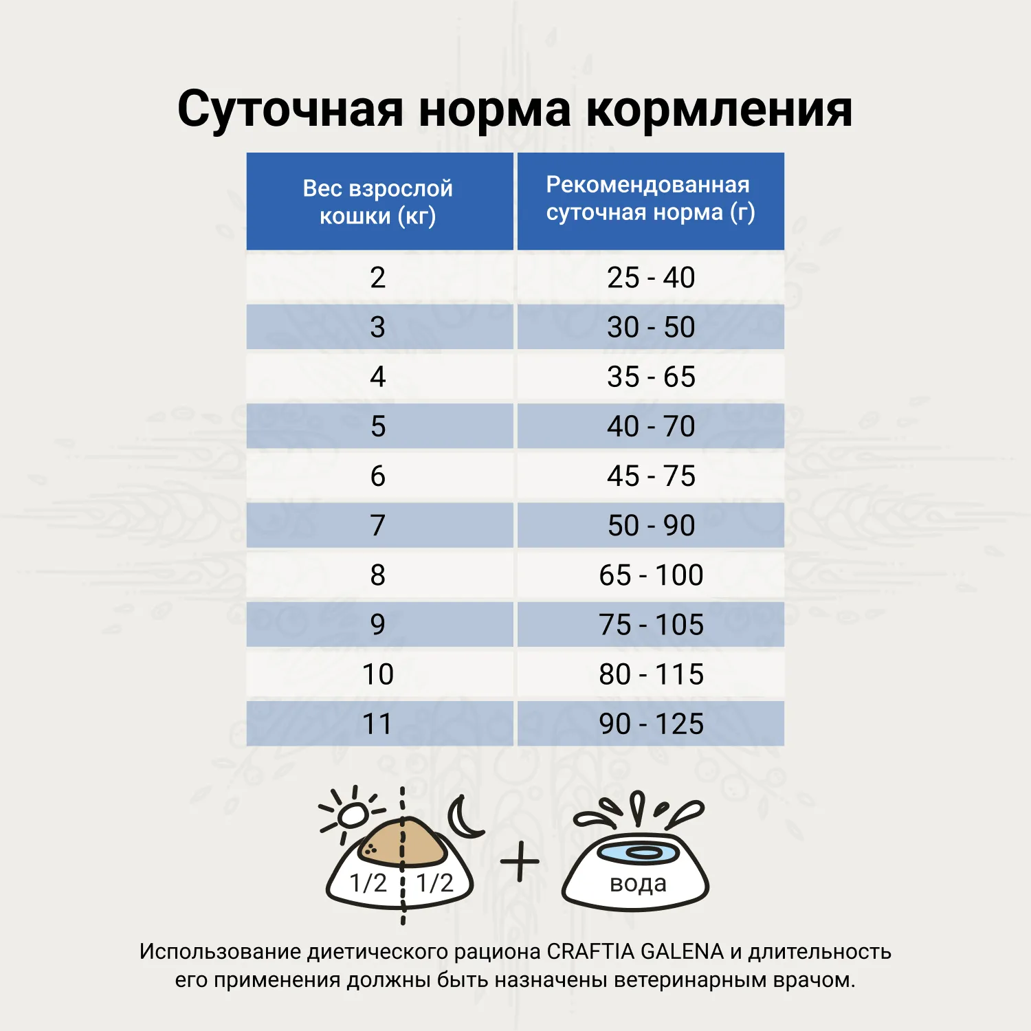Craftia Galena Urinary Care - полнорационный диетический корм, разработан для растворения струвитных камней в мочевом пузыре и снижения частоты проявления рецидивов. Рекомендован для применения в случаях заболеваний нижних отделов мочевыводящих путей у кошек. Рацион обеспечивает подкисление мочи и имеет низкое содержание магния, что способствует растворению камней. Струвитные камни являются одной из частых причин урологического синдрома у кошек.