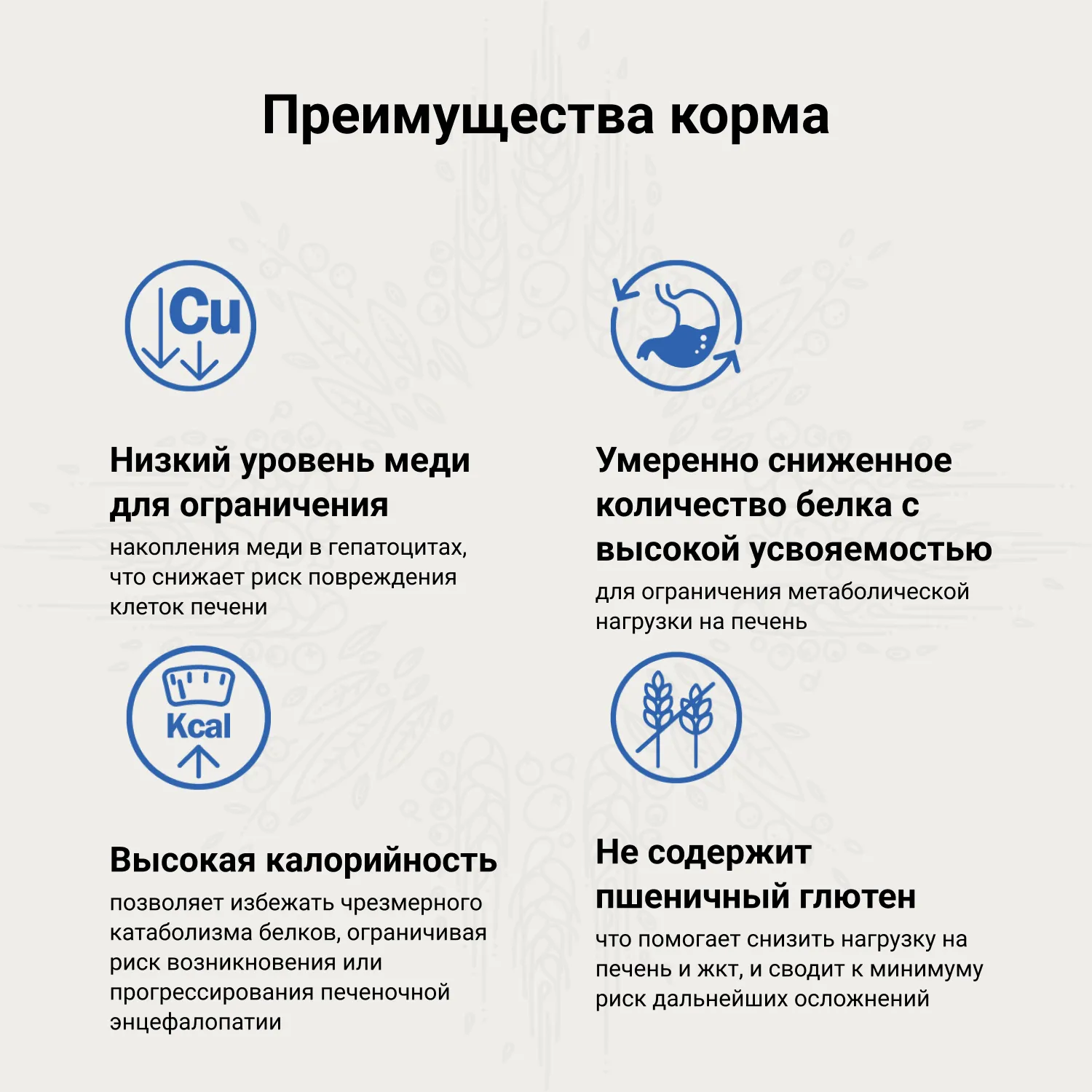 В составе корма, тщательно отобранные легкоусвояемые и высококачественные белки, в частности яичный белок в умеренном количестве, которые помогают снизить метаболическую нагрузку на печень. Ограниченное содержание меди в рационе помогает снизить риск повреждения клеток печени.
