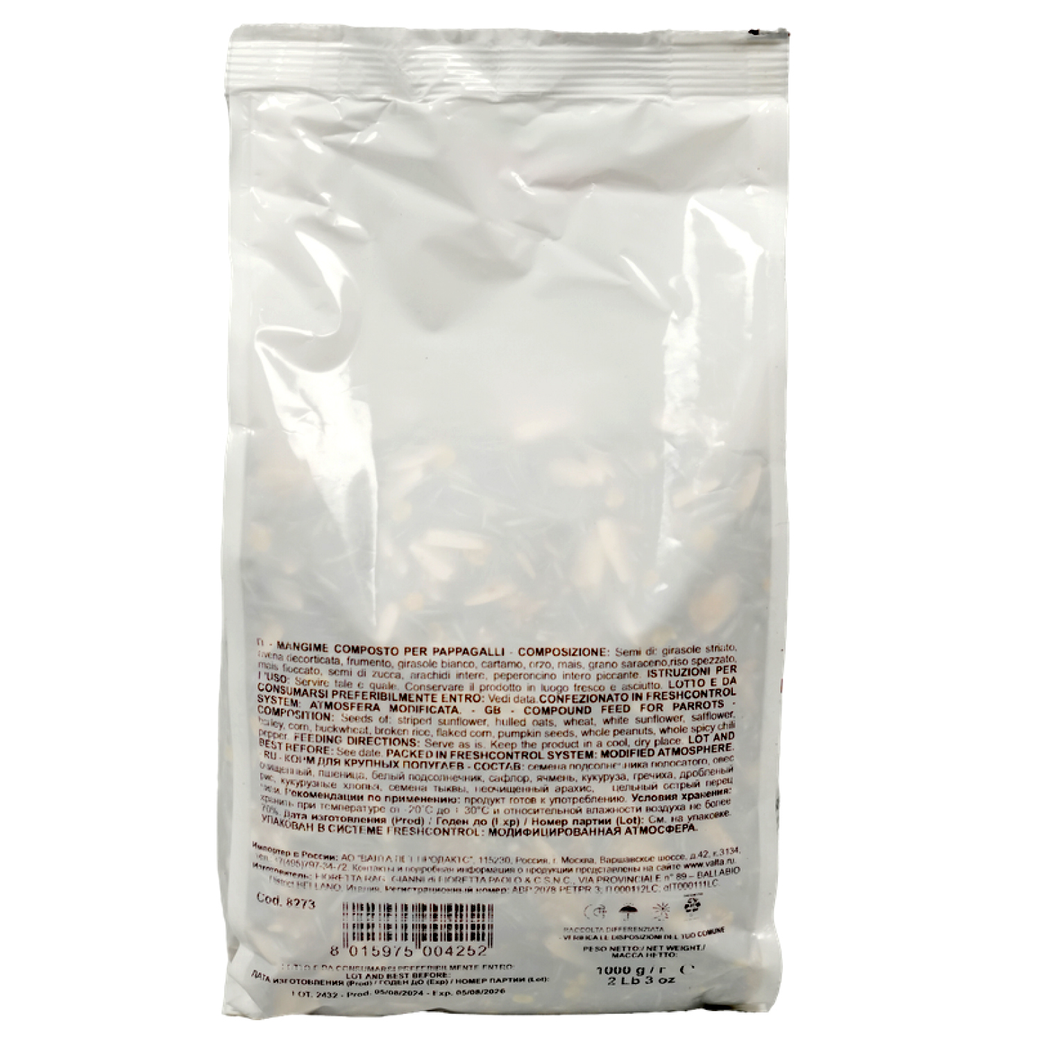 Корм содержит различные семена, которые составляют разнообразный и полезный рацион попугаев.