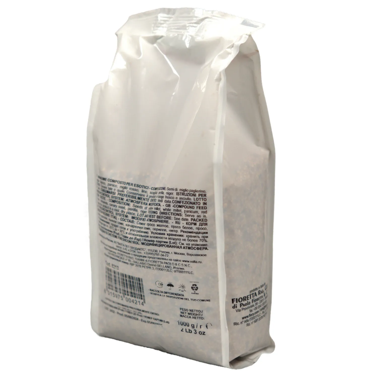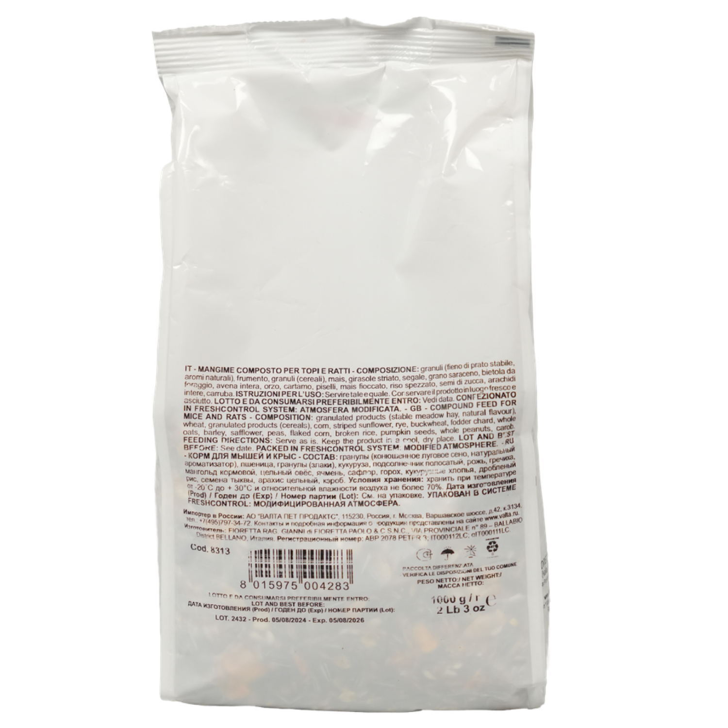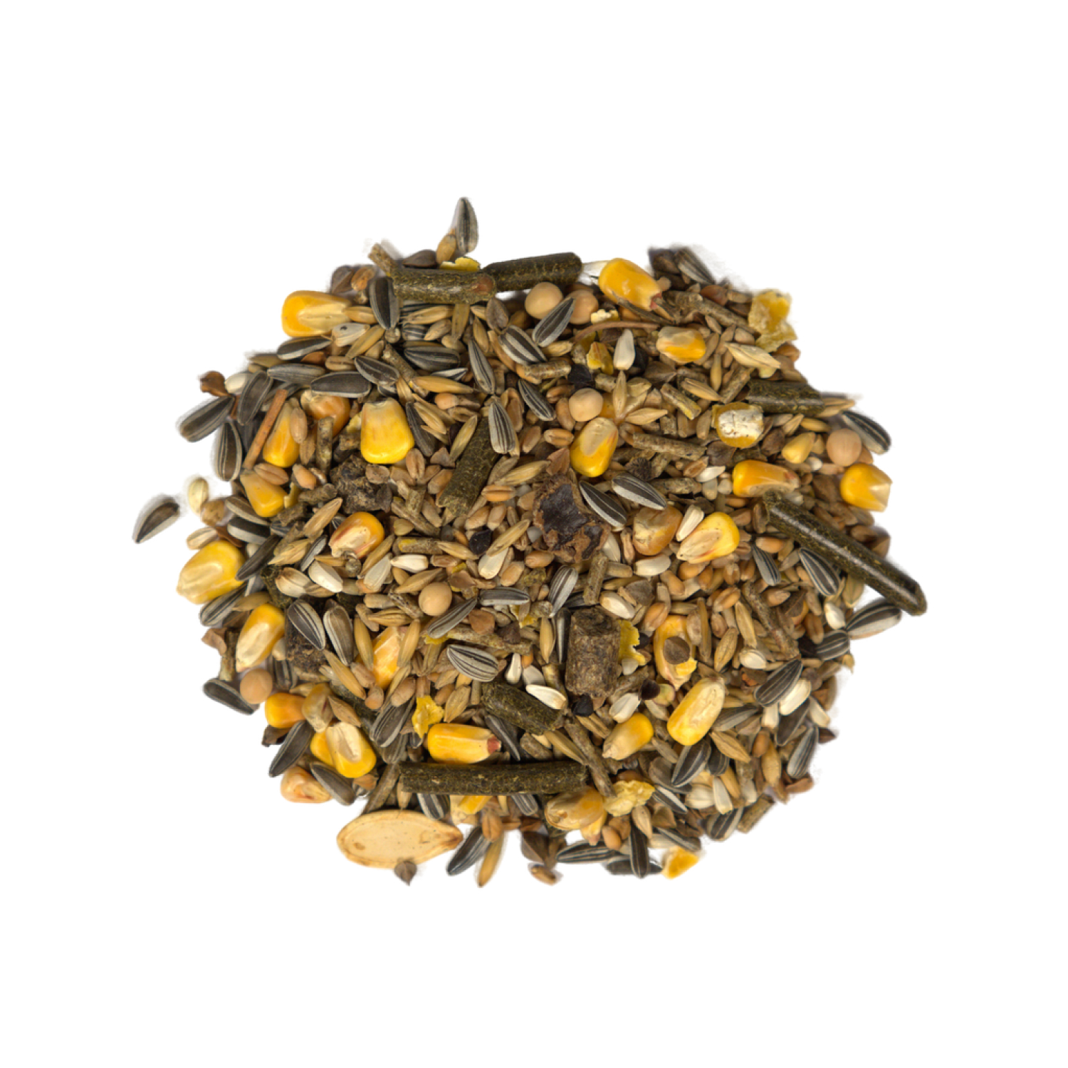 Корм содержит различные виды злаков, гранулы сена, семена тыквы, мангольд, семена подсолнечника, сафлор, арахис, кэроб.
