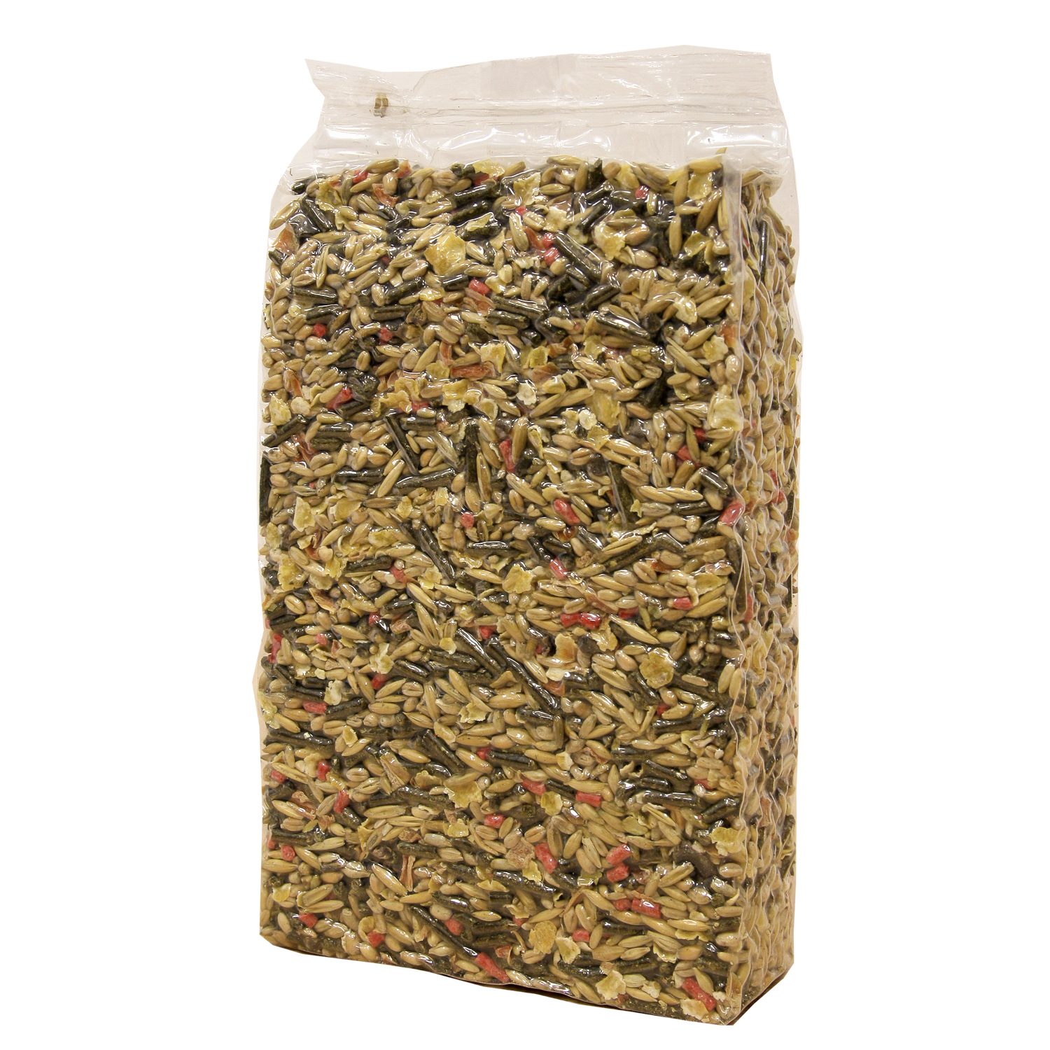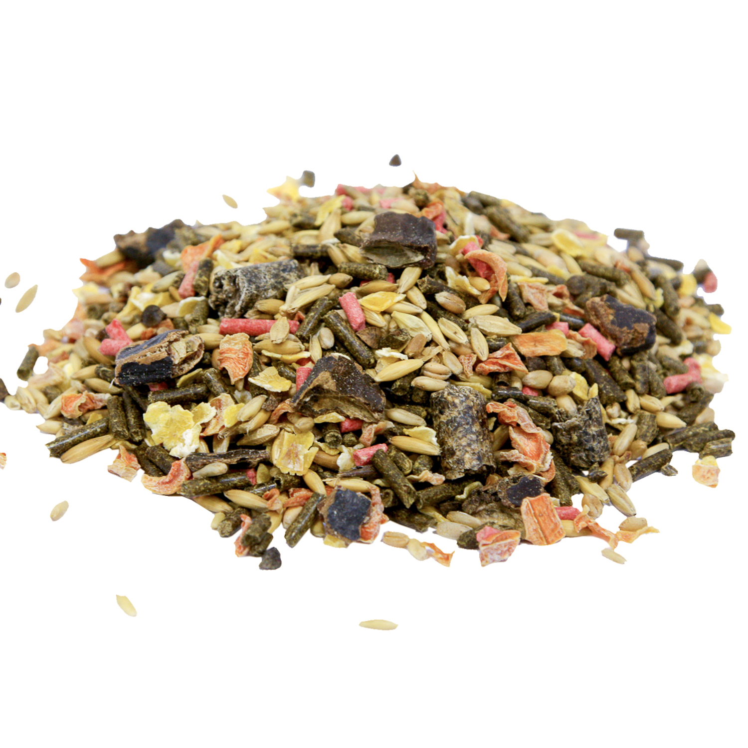 Смесь состоит из полезных зерен, цельного и очищенного овса, моркови, свеклы, ячменя, плодов рожкового дерева, кукурузных хлопьев и специальных гранул, обогащенных минералами, витаминами и другими полезными веществами (юкка, органический селен, инулин и др.), обеспечивающими здоровое функционирование организма вашего питомца.