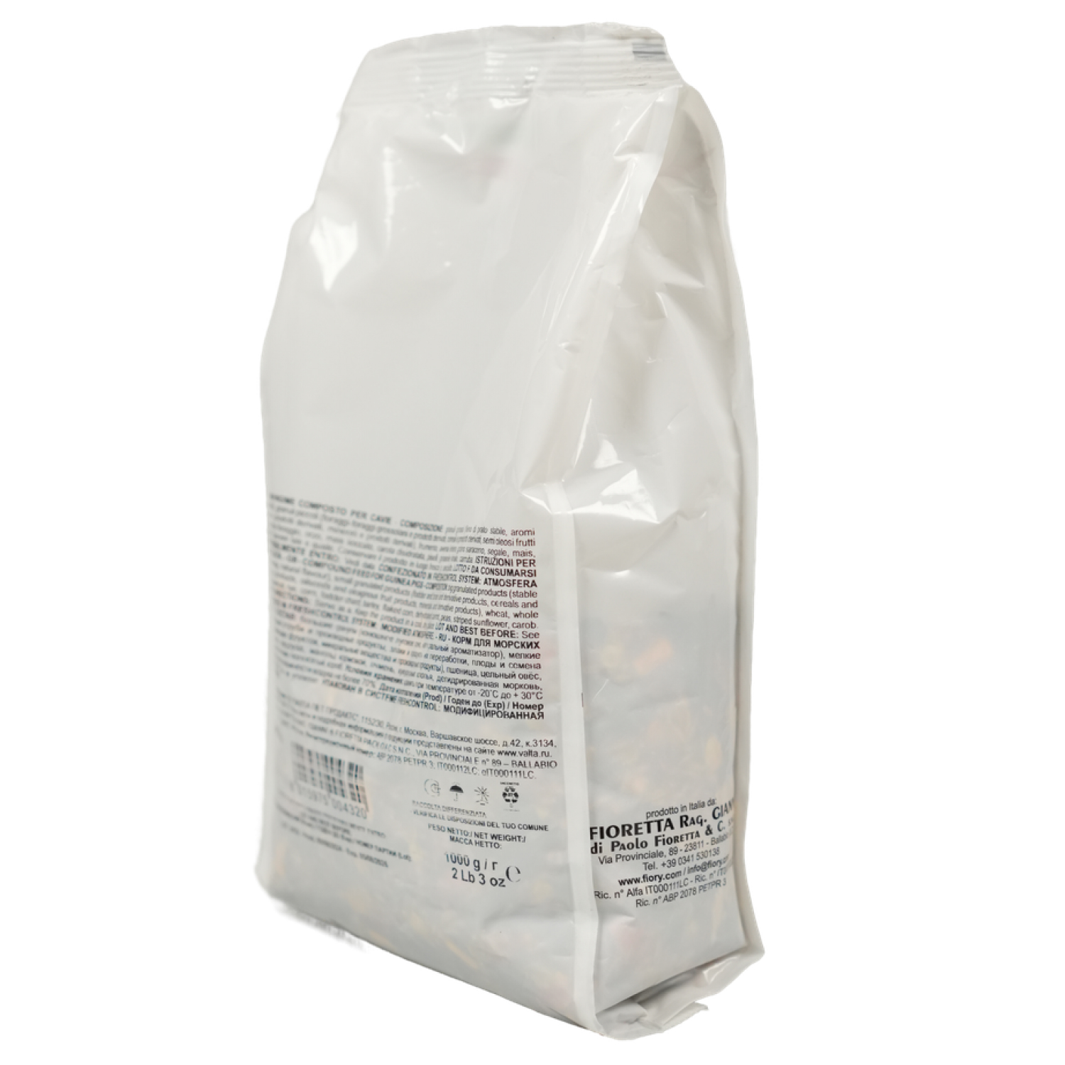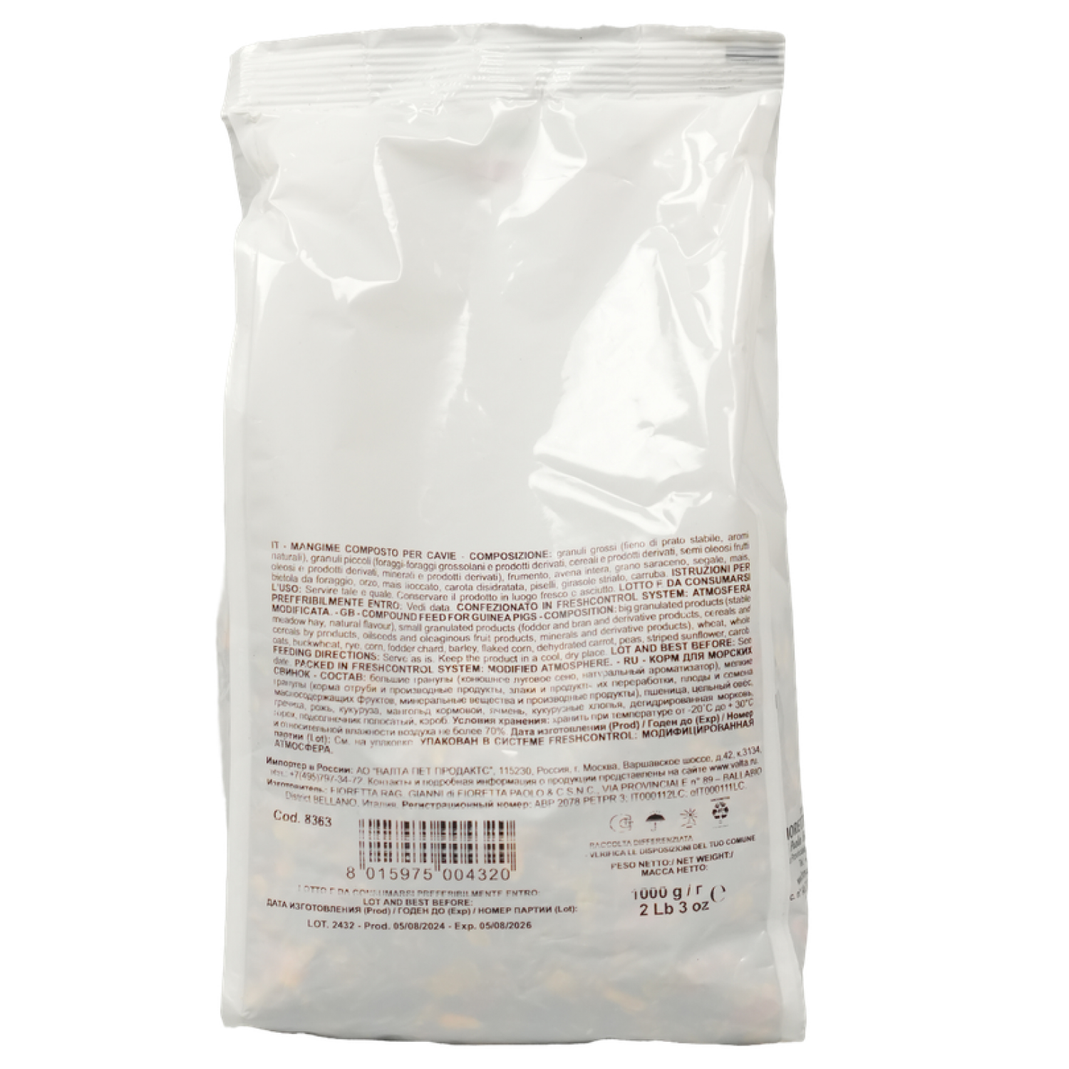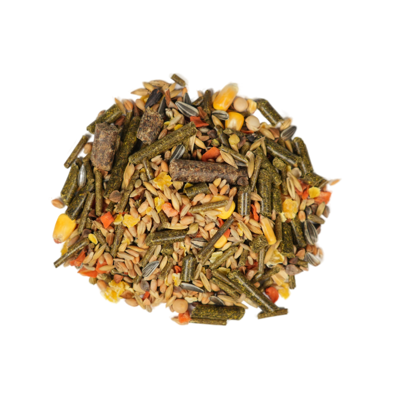 Корм содержит различные виды злаков, гранулы сена, мангольд, семена подсолнечника, дегидрированную морковь,горох, кэроб.