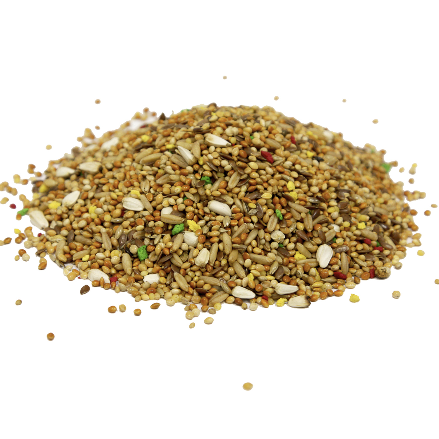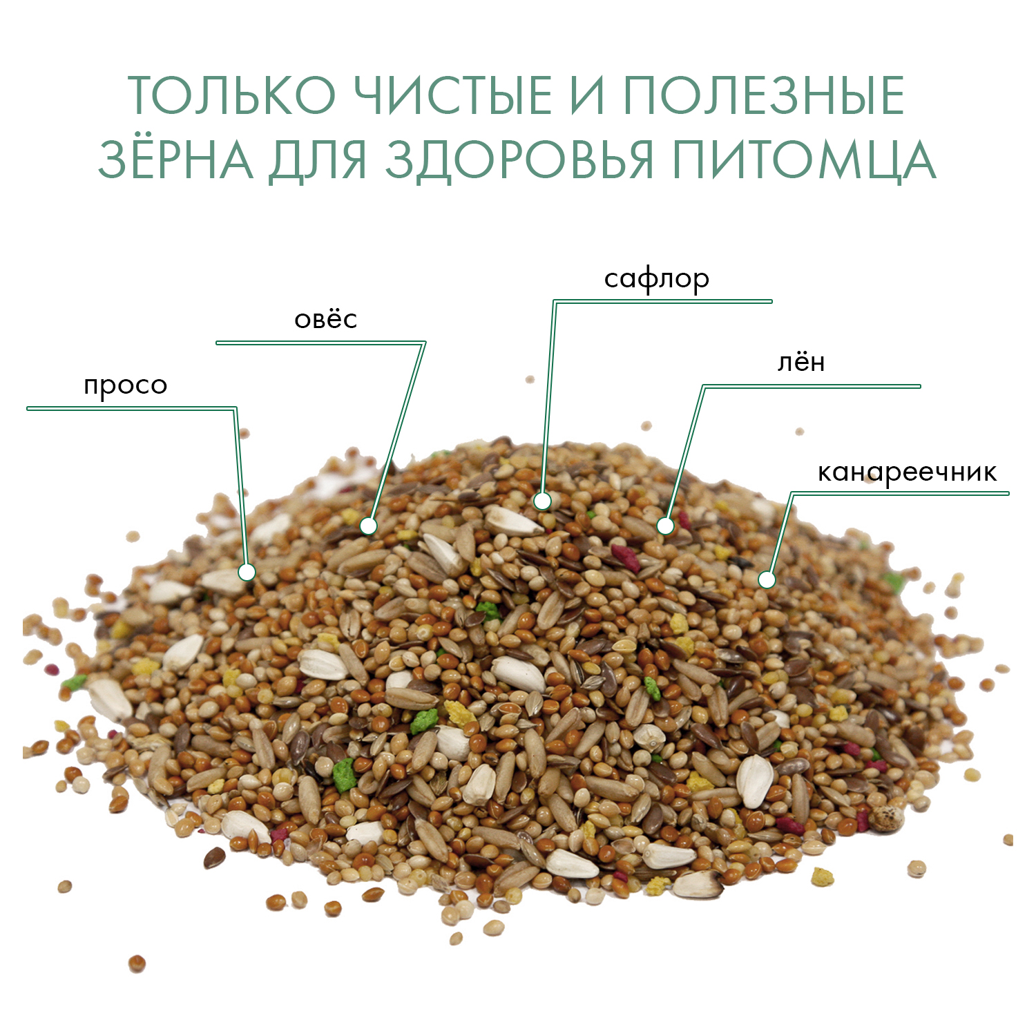 В состав входит желтое просо, красное просо, овес лущеный, белое просо, лён, сафлор канареечный, семена канареечника, пекарные продукты.