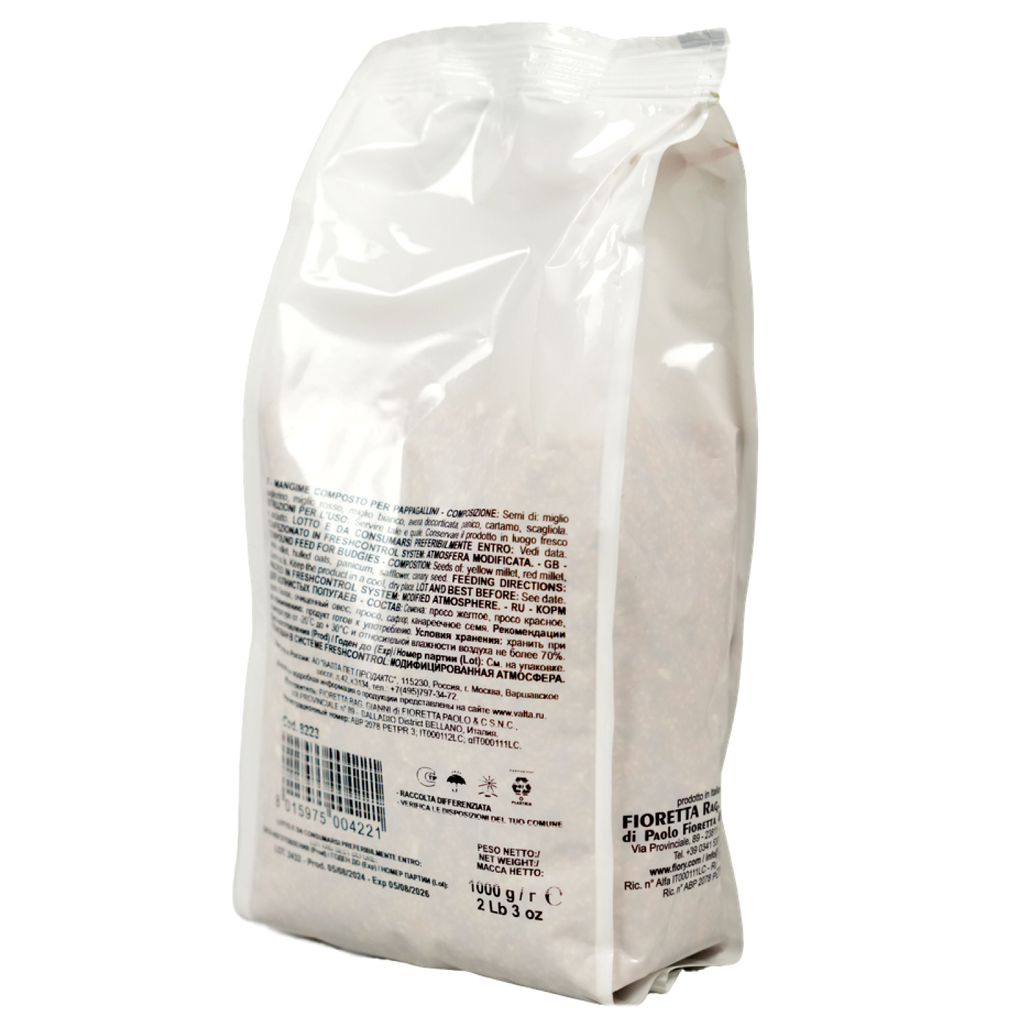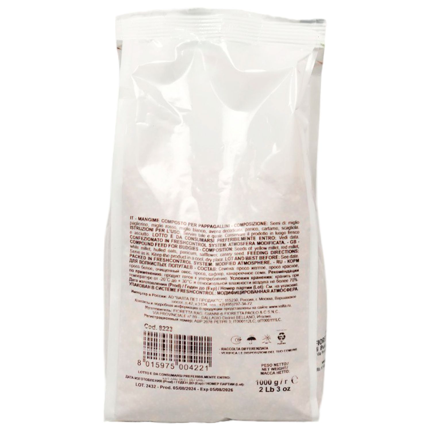 Корм содержит различные семена, обеспечивающие сбалансированный и разнообразный рацион для волнистых попугаев.