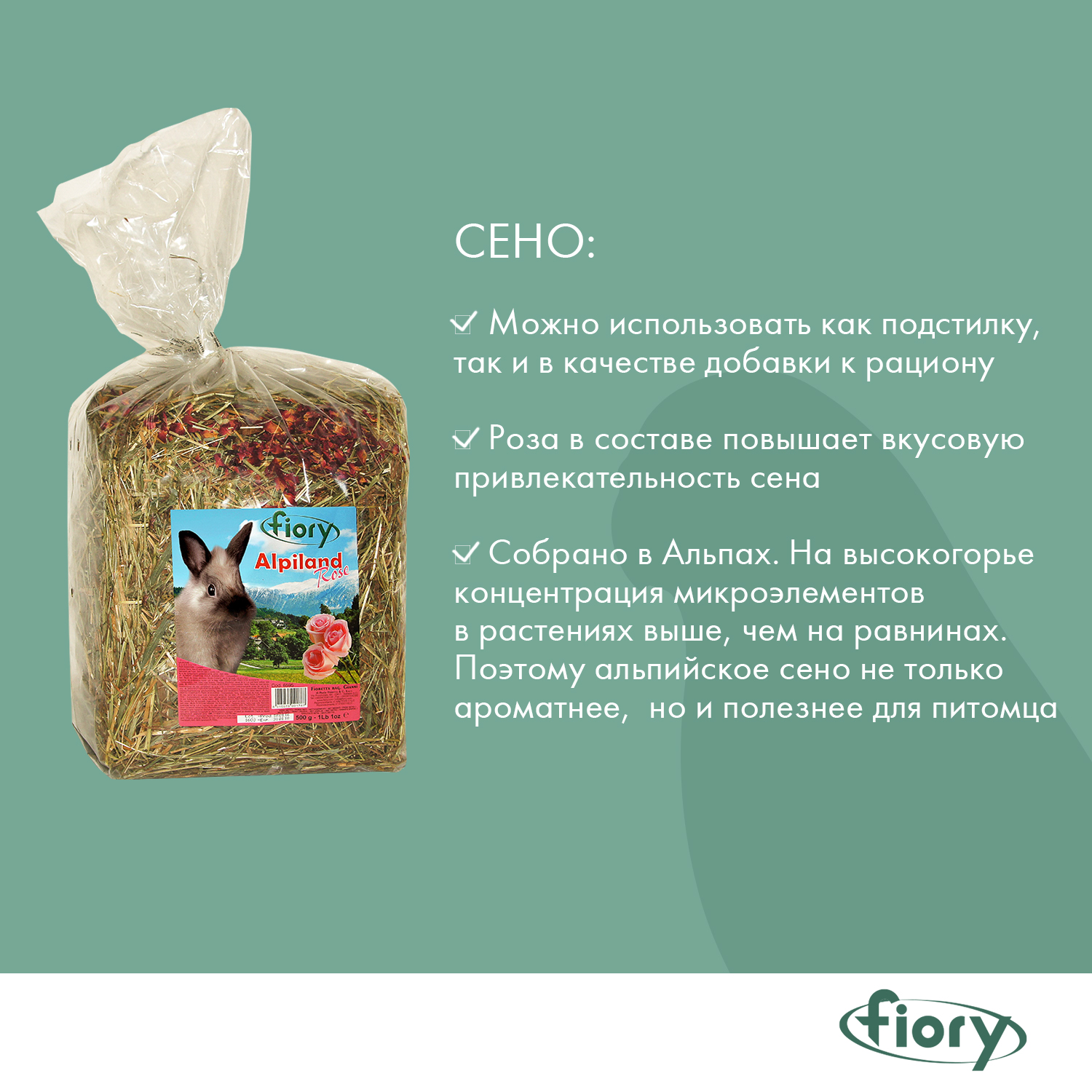 А еще компания Fiory использует сено второго укоса, т.к. оно содержит клетчатку, которая хорошо усваивается травоядными грызунами!