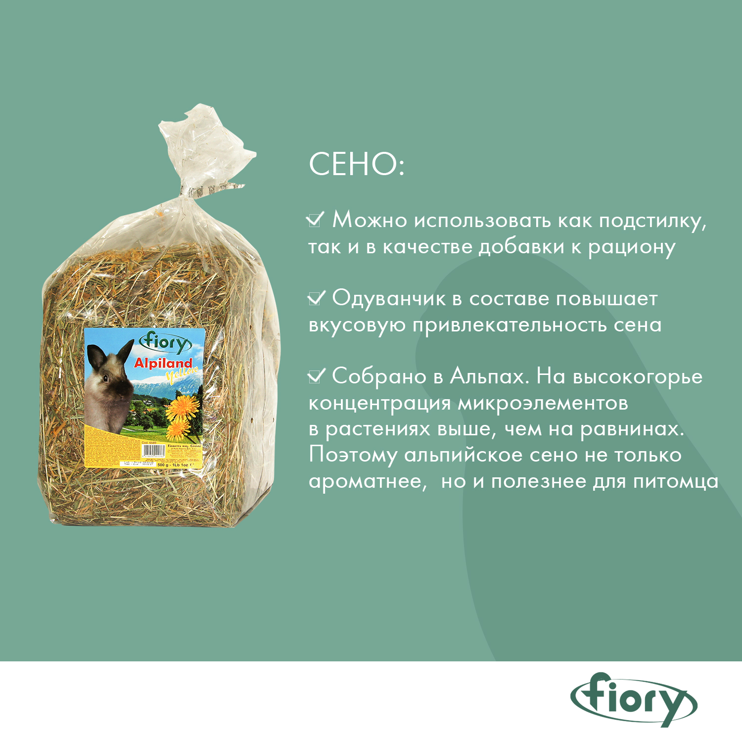 А еще компания Fiory использует сено второго укоса, т.к. оно содержит клетчатку, которая хорошо усваивается травоядными грызунами!