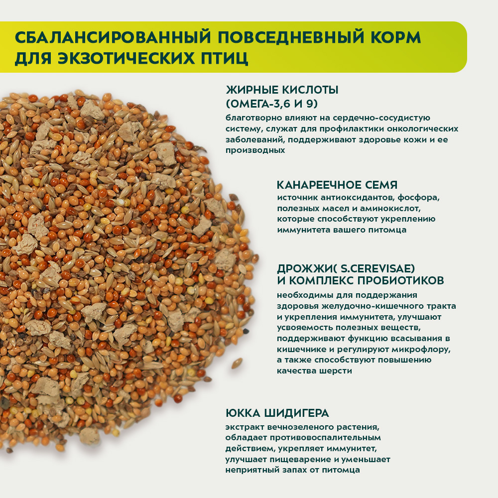 просо красное, просо желтое, семя канареечное, семена пайзы, витаминные гранулы, юкка шидигера, рапс, семена чиа, комплекс пробиотиков, натуральный адсорбент - дрожжи (S.cerevisae).