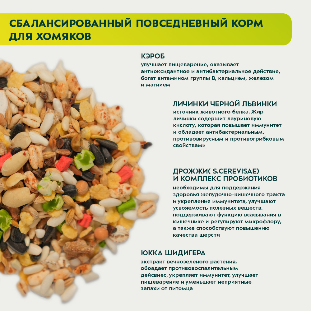 Сбалансированный повседневный корм для хомяков создан с заботой о ваших малышах. Наши специалисты подобрали ингредиенты с учётом видовых особенностей питания хомяков. В состав рациона входит комплекс витаминов для крепкого здоровья, личинки чёрной львинки для насыщенного вкуса, омега-3 и 6 для здоровой кожи и шерсти. Корм Bambini Pets не только вкусный, но и полезный.