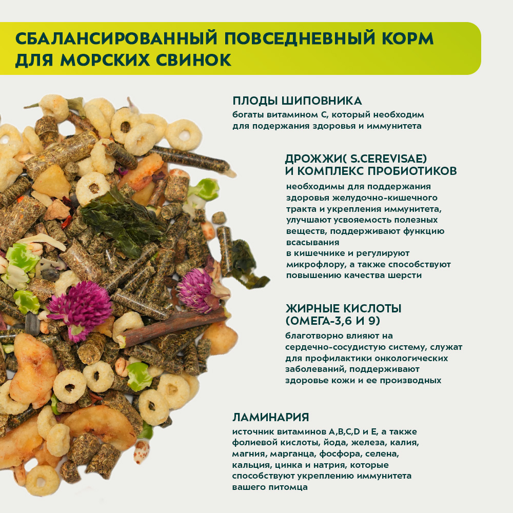 Сбалансированный повседневный корм для морских свинок создан с заботой о ваших малышах. Наши специалисты подобрали ингредиенты с учётом видовых особенностей питания морских свинок. В состав рациона входит комплекс витаминов для крепкого здоровья, овощи и фрукты для насыщенного вкуса, веточки березы для равномерного стачивания зубов. Корм Bambini Pets не только вкусный, но и полезный.