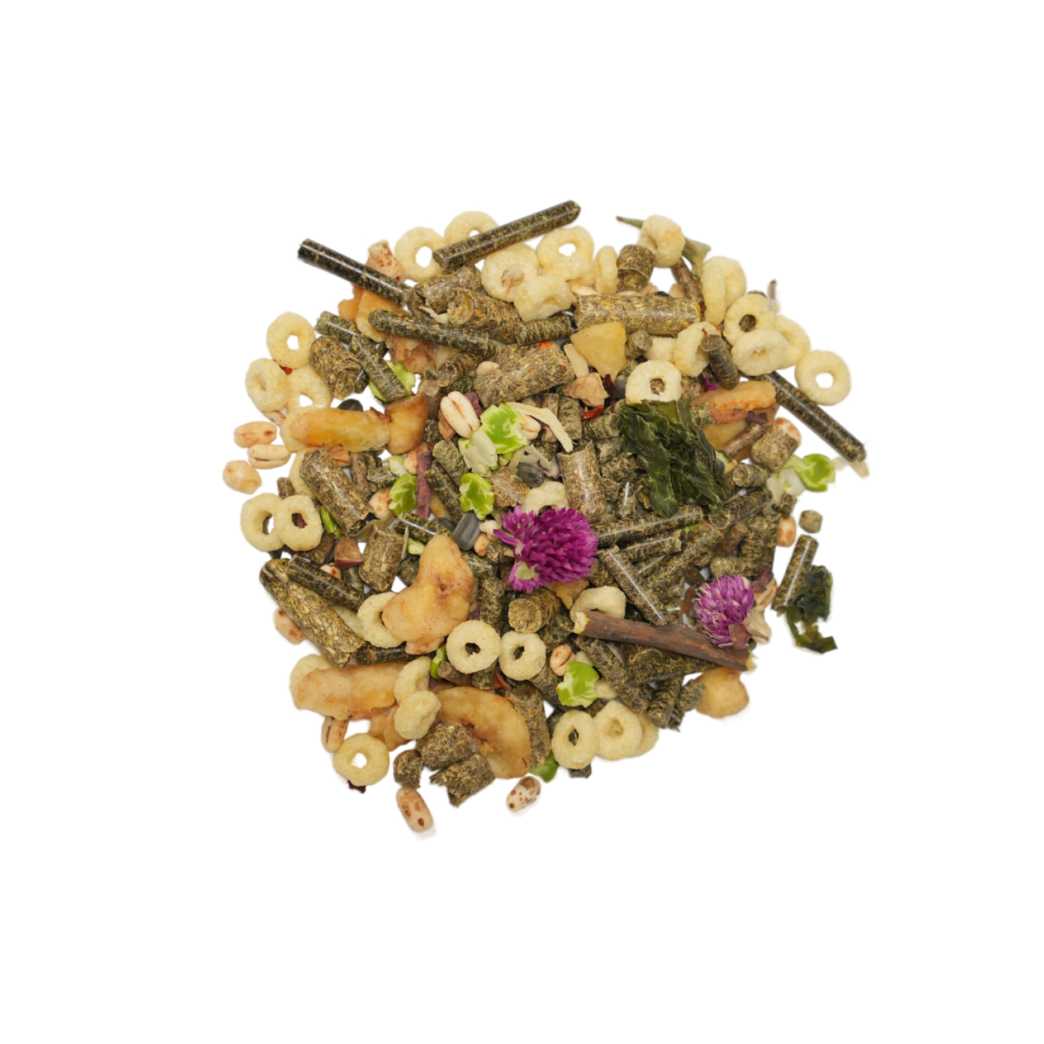 СОСТАВ: гранулы из смеси трав (райграсс, тимофеевка, мятлик), гранулы из люцерны, мультивитаминные гранулы (зернопродукты, травяная мука, свекловичный жом, дрожжи, витаминно-минеральный премикс), плющеный горох, семечки подсолнечника, колечко экструдированное, свекла, плоды шиповника, морковь, сушеные яблоки, чипсы банана, ячмень воздушный, паприка, березовые веточки, цветы клевера, ламинария, юкка шидигера, комплекс пробиотиков, натуральный адсорбент – дрожжи (S.cerevisae). Питательная ценность на 100г : белки 12,99%, жиры 1,12%, углеводы 25,29%, клетчатка 21,8%, зола 3,68%, полиненасыщенные жирные кислоты (включая омега-3, 6 и 9) 1,62%, влага 4,50%, кальций 390,24 мг, фосфор 180,27 мг, калий 794,40 мг, медь 0,53 мг, марганец 1,78 мг, цинк 3,13 мг, витамин А 72,85 мкг, витамин С 19,85 мг, витамин В1 0,75 мг, витамин В3 13,71 мг, витамин В12 0,90 мкг. Энергетическая ценность на 100г: 93,01 ккал.Ингредиенты
