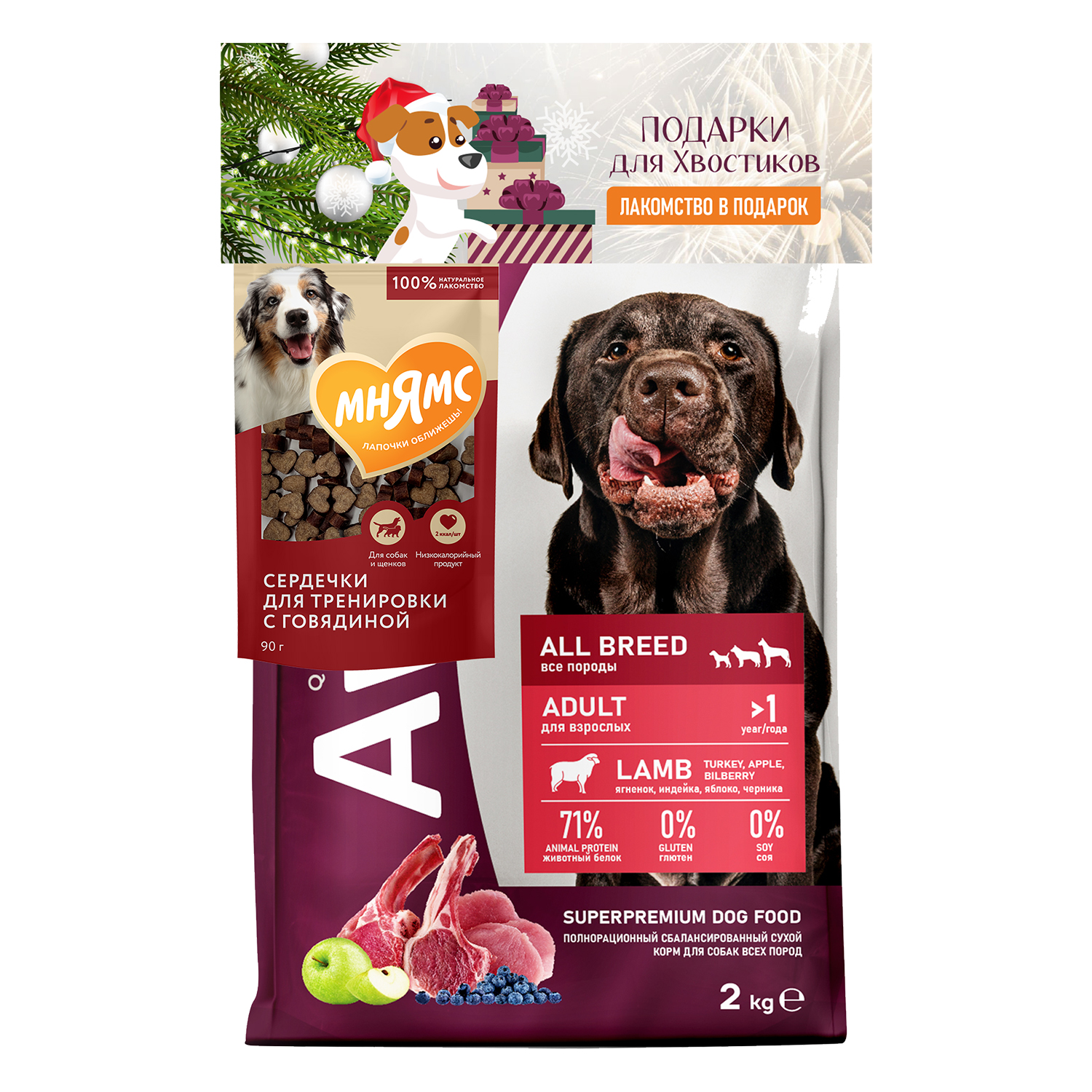 Новогодний набор для собак Сухой корм AWARD для взрослых собак всех пород с ягненком и индейкой + ПОДАРОК тренировочное лакомство МНЯМС "Сердечки"