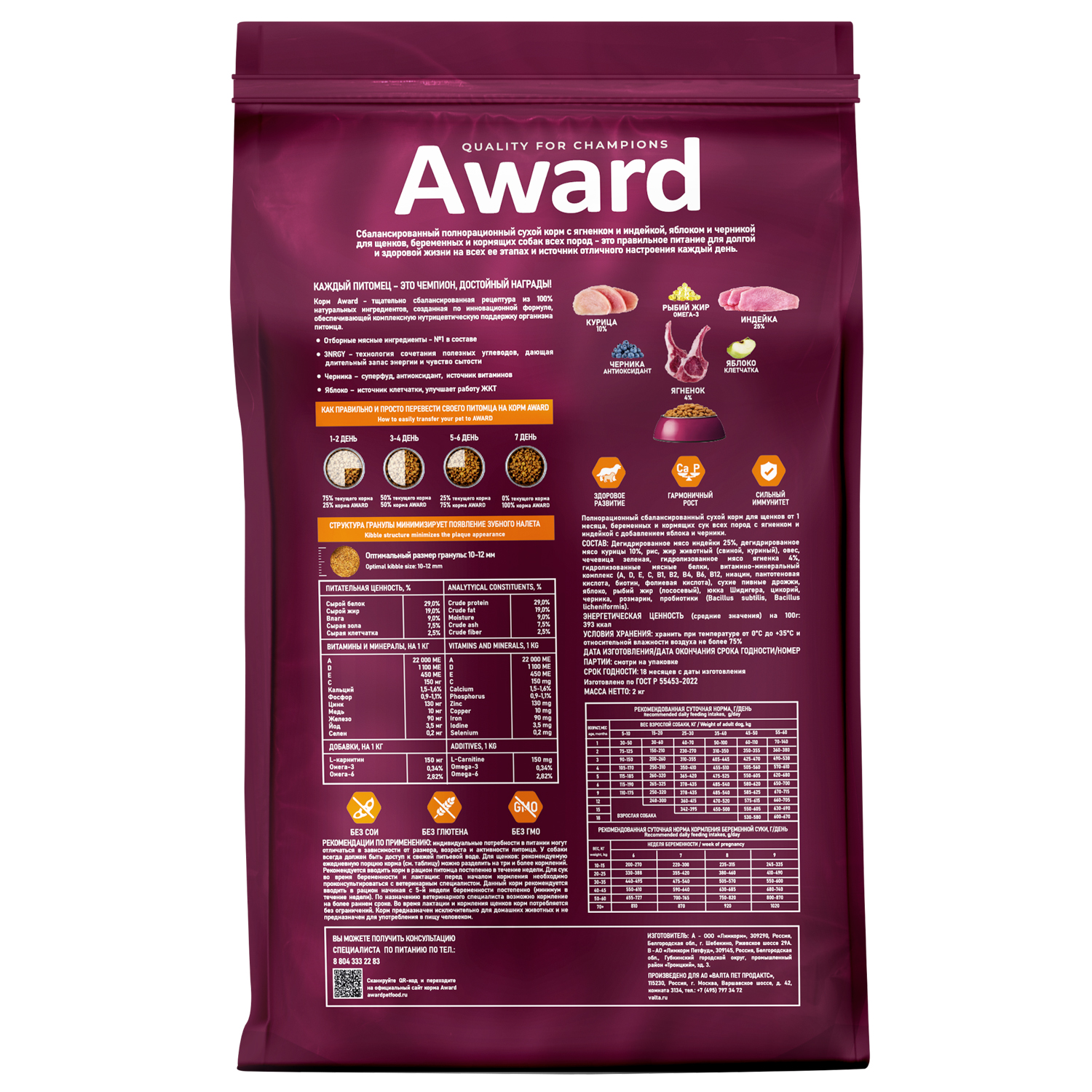 Сухой корм AWARD для щенков от 1 месяца, беременных и кормящих сук всех пород с ягненком и индейкой с добавлением яблока и черники 800г