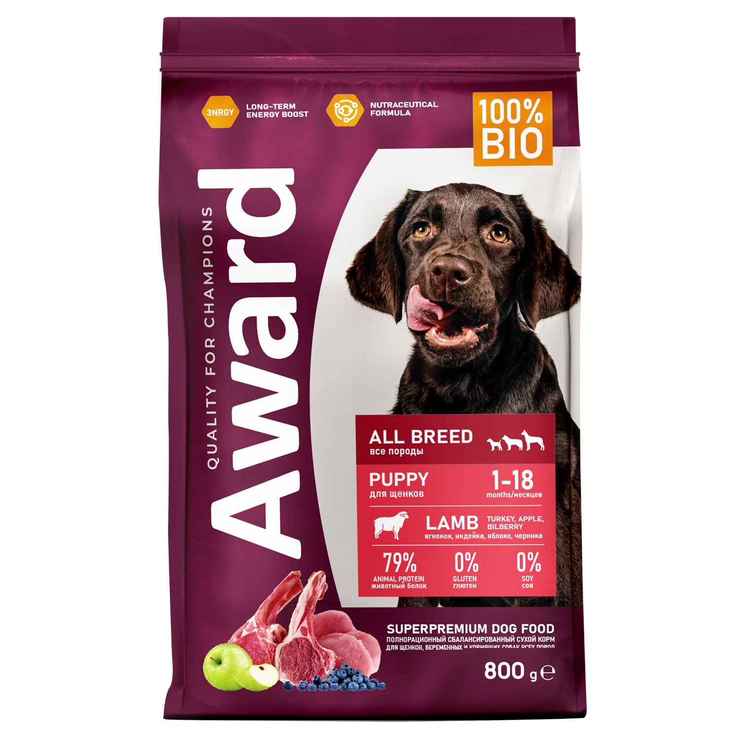 Сухой корм AWARD для щенков от 1 месяца, беременных и кормящих сук всех пород с ягненком и индейкой с добавлением яблока и черники 800 г.
