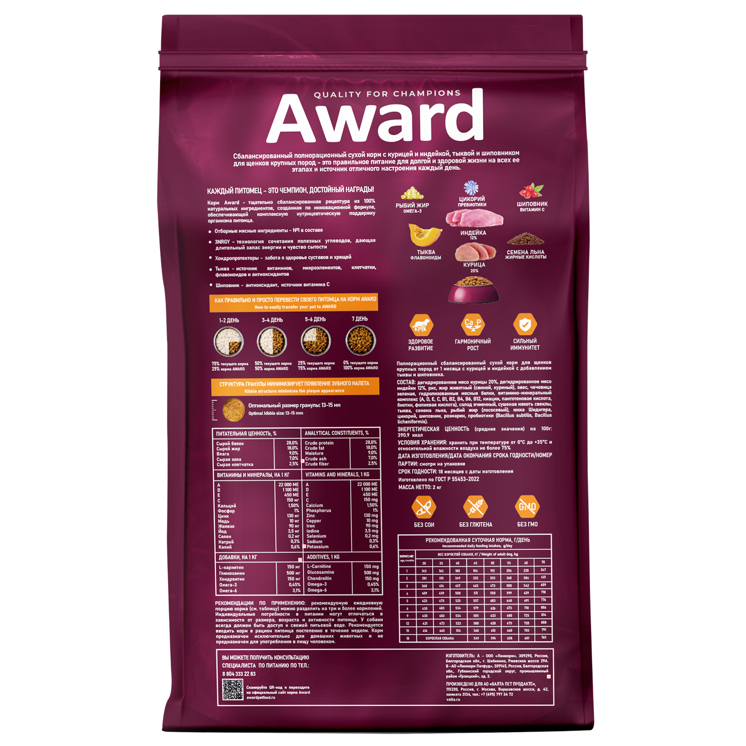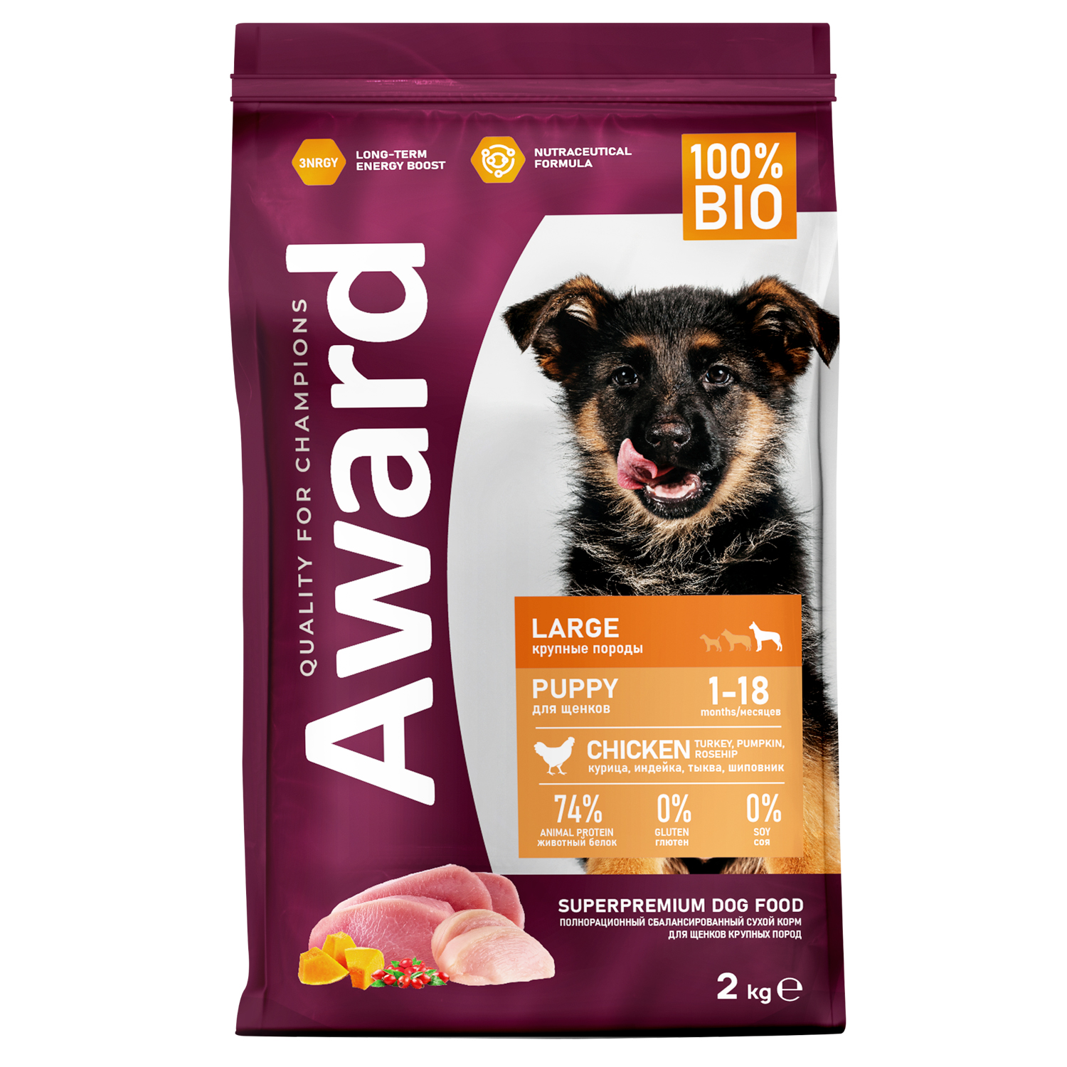 Сухой корм AWARD для щенков от 1 месяца крупных пород с курицей и индейкой с добавлением тыквы и шиповника 2кг