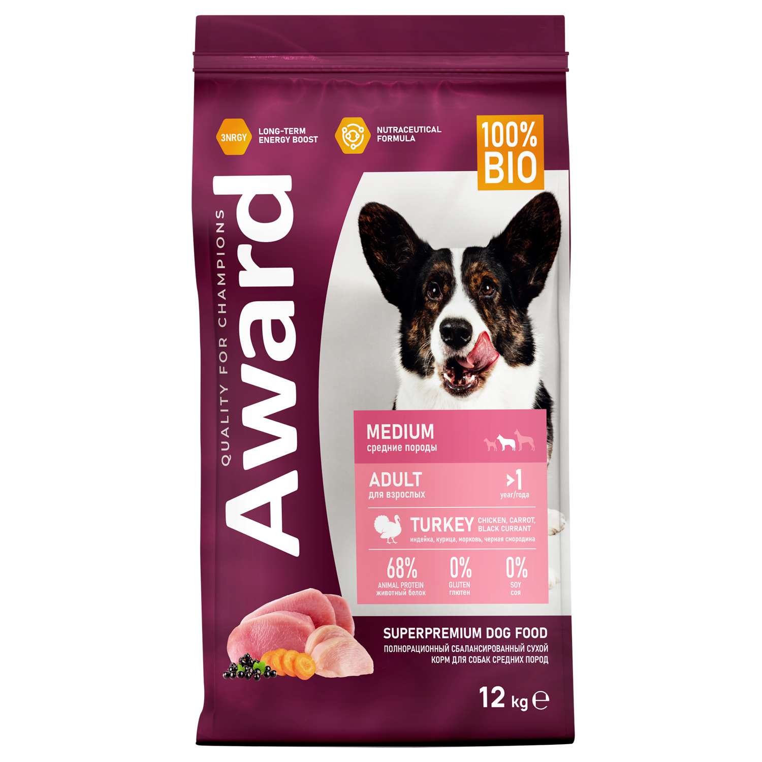 Сухой корм AWARD для взрослых собак средних пород с индейкой и курицей с добавлением моркови и черной смородины 12кг