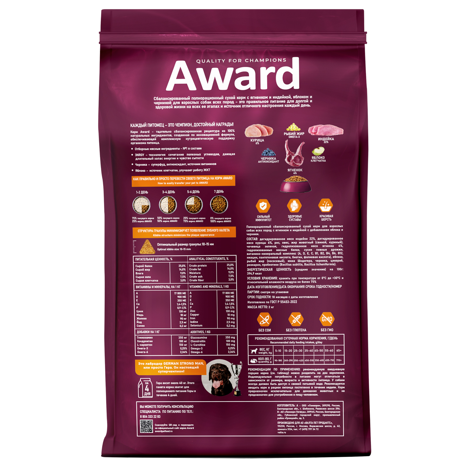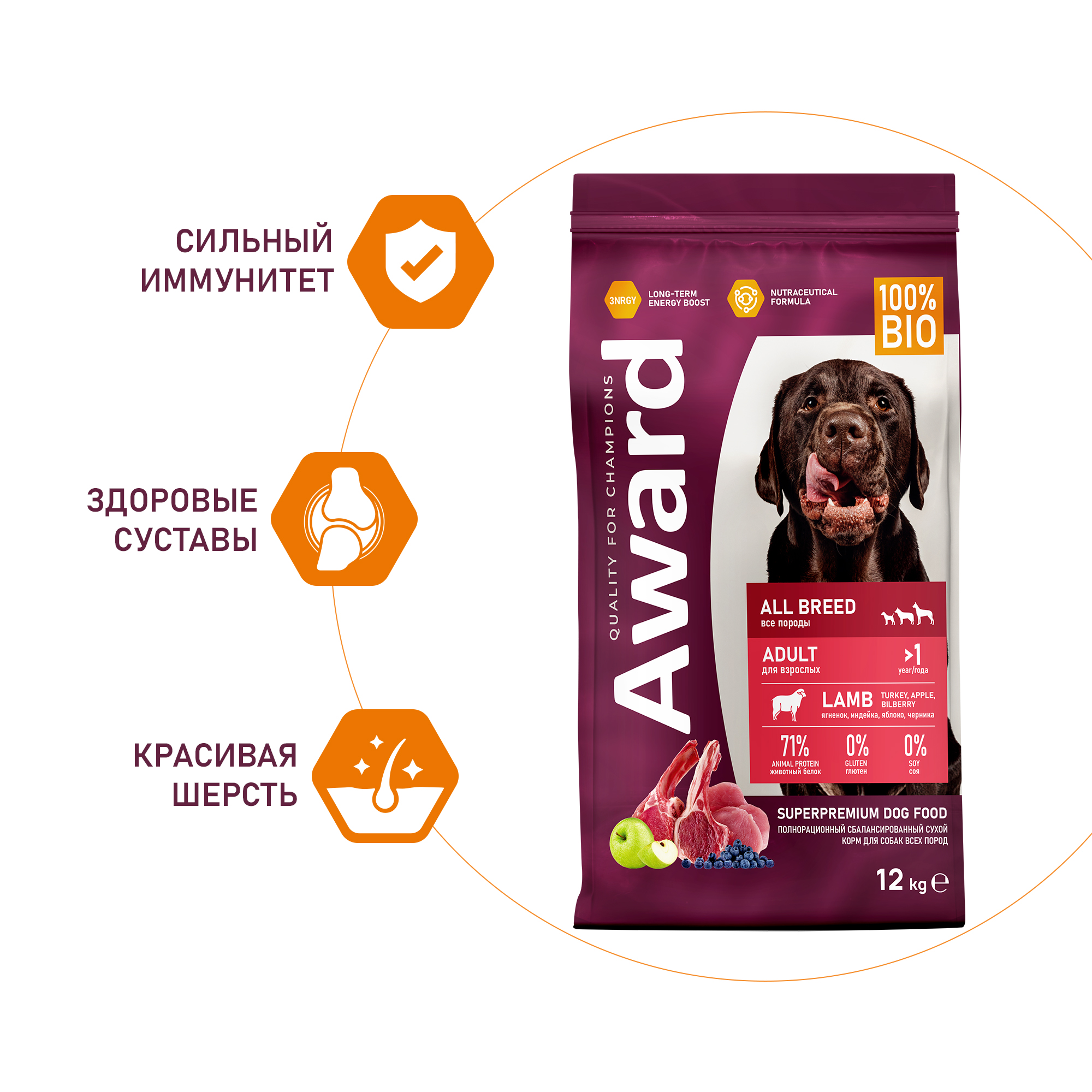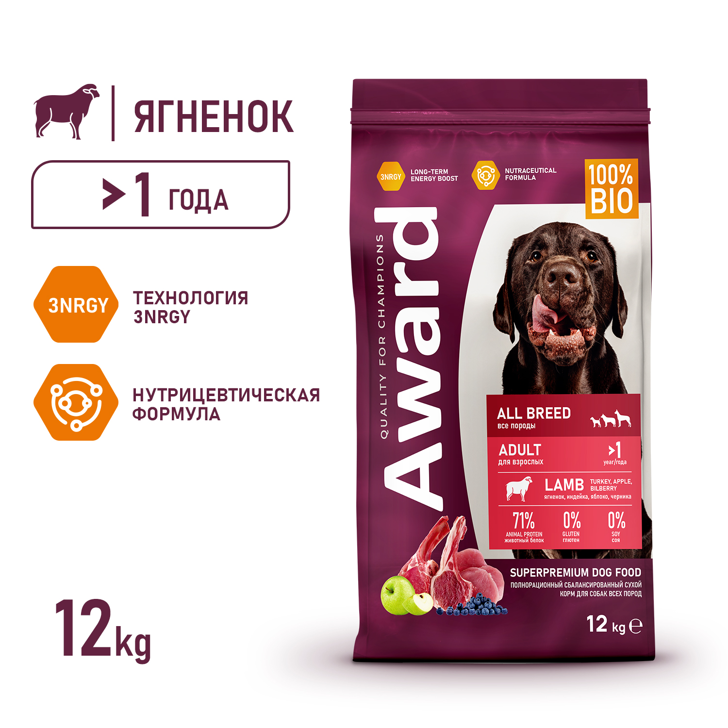Сухой корм AWARD для взрослых собак всех пород с ягненком и индейкой с добавлением яблока и черники 12кг