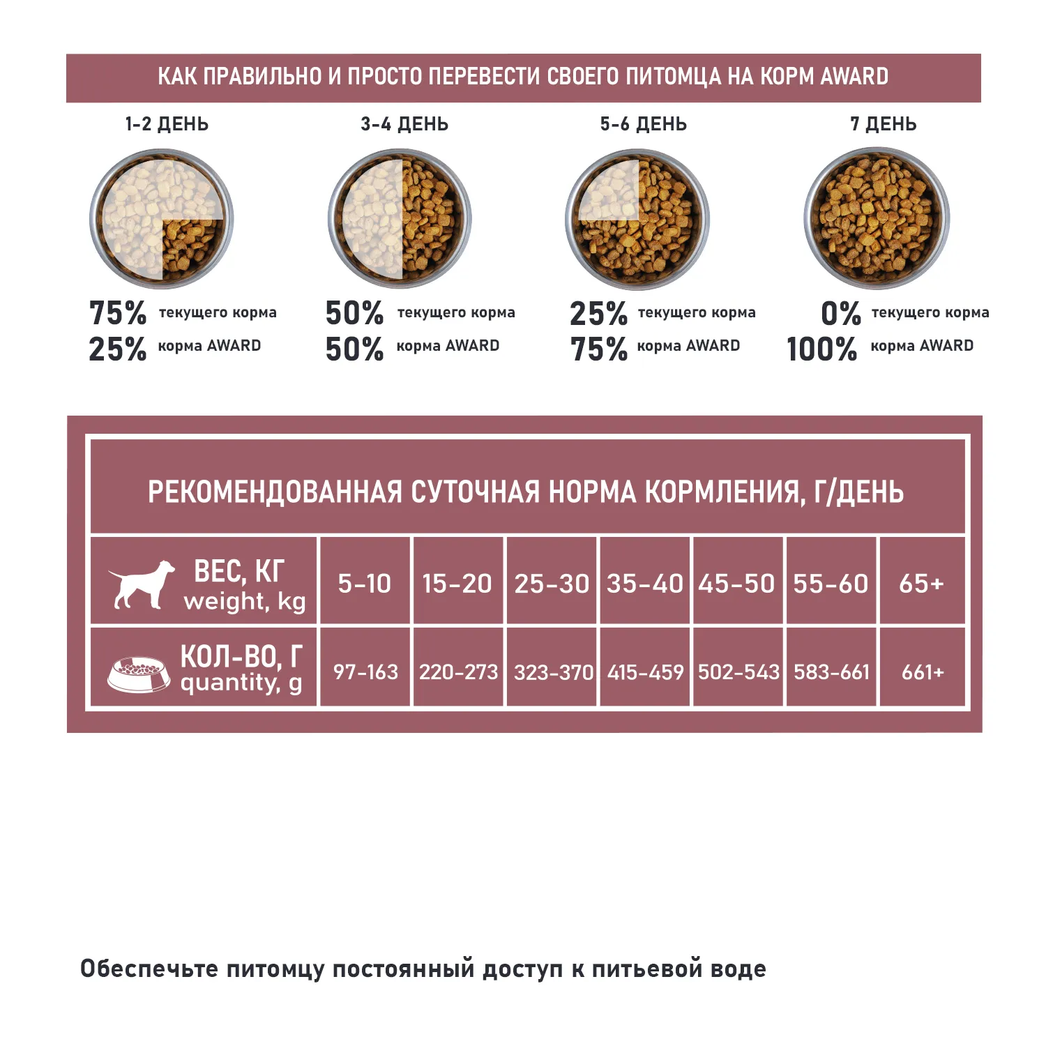 РЕКОМЕНДАЦИИ ПО ПРИМЕНЕНИЮ: рекомендуемую ежедневную порцию корма (см. таблицу) можно разделить на два кормления. индивидуальные потребности в питании могут отличаться в зависимости от размера, возраста и активности питомца. У собаки всегда должен быть доступ к свежей питьевой воде. Рекомендуется вводить корм в рацион питомца постепенно в течение недели. Корм предназначен исключительно для домашних животных и не предназначен для употребления в пищу человеком.