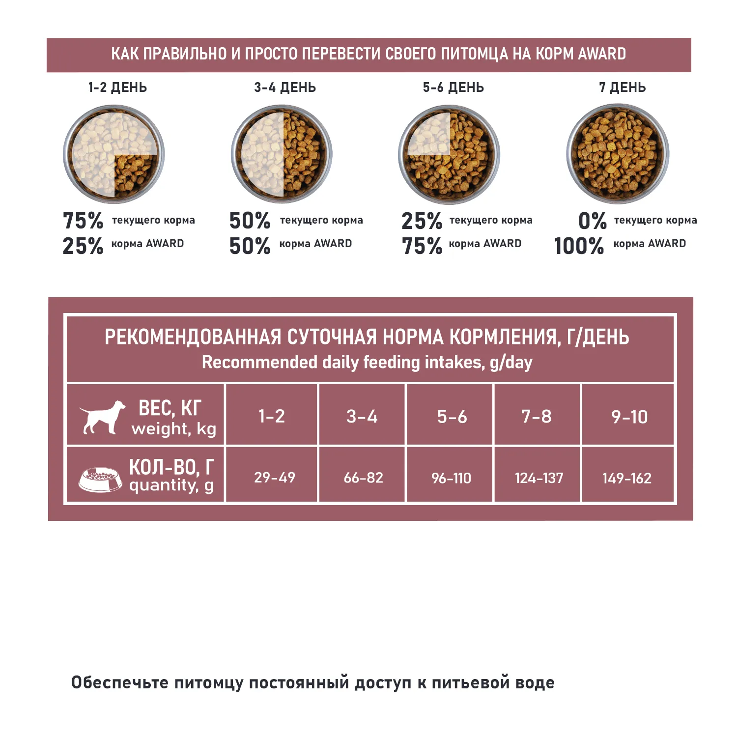 Корм Award - тщательно сбалансированная рецептура из 100% натуральных ингредиентов, созданная по инновационной формуле, обеспечивающей комплексную нутрицевтическую поддержку организма питомца.