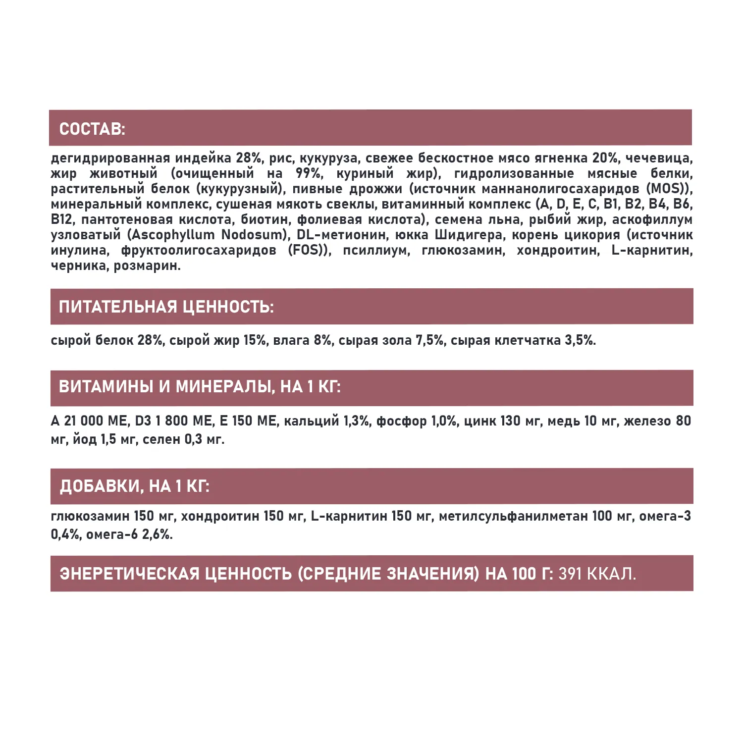 СОСТАВ: дегидрированная индейка 28%, рис, кукуруза, свежее бескостное мясо ягненка 20%, чечевица, жир животный (очищенный на 99%, куриный жир), гидролизованные мясные белки, растительный белок (кукурузный), пивные дрожжи (источник маннанолигосахаридов (MOS)), минеральный комплекс, сушеная мякоть свеклы, витаминный комплекс (A, D, E, C, B1, B2, B4, B6, B12, пантотеновая кислота, биотин, фолиевая кислота), семена льна, рыбий жир, аскофиллум узловатый (Ascophyllum Nodosum), DL-метионин, юкка Шидигера, корень цикория (источник инулина, фруктоолигосахаридов (FOS)), псиллиум, глюкозамин, хондроитин, L-карнитин, черника, розмарин.ПИТАТЕЛЬНАЯ ЦЕННОСТЬ: сырой белок 28%, сырой жир 15%, влага 8%, сырая зола 7,5%, сырая клетчатка 3,5%.