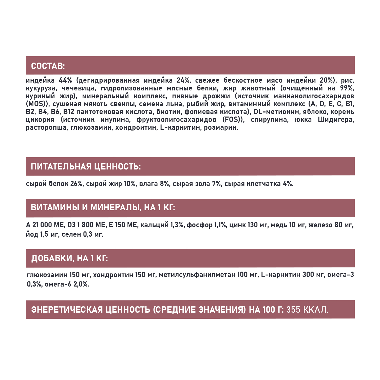 СОСТАВ: индейка 44% (дегидрированная индейка 24%, свежее бескостное мясо индейки 20%), рис, кукуруза, чечевица, гидролизованные мясные белки, жир животный (очищенный на 99%, куриный жир), минеральный комплекс, пивные дрожжи (источник маннанолигосахаридов (MOS)), сушеная мякоть свеклы, семена льна, рыбий жир, витаминный комплекс (A, D, E, C, B1, B2, B4, B6, B12 пантотеновая кислота, биотин, фолиевая кислота), DL-метионин, яблоко, корень цикория (источник инулина, фруктоолигосахаридов (FOS)), спирулина, юкка Шидигера, расторопша, глюкозамин, хондроитин, L-карнитин, розмарин.ПИТАТЕЛЬНАЯ ЦЕННОСТЬ: сырой белок 26%, сырой жир 10%, влага 8%, сырая зола 7%, сырая клетчатка 4%.