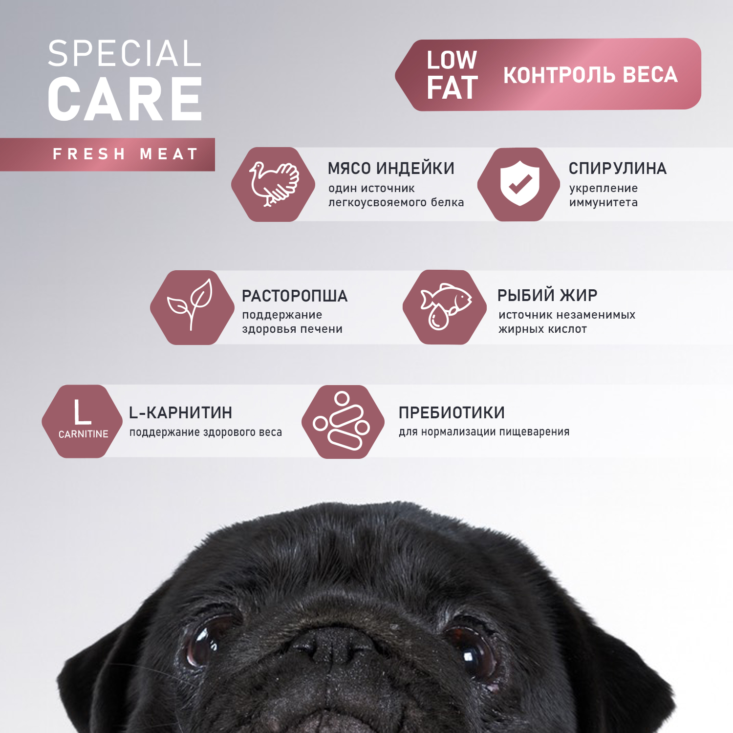 Сбалансированный полнорационный сухой корм со свежим мясом индейки с добавлением расторопши, яблока и спирулины - это функциональное питание для взрослых собак всех пород, которое поддерживает идеальный вес питомца благодаря сниженному содержанию жира и источникам биологически активных веществ в составе, обеспечивая комплексную заботу о здоровье вашего питомца на долгие годы.