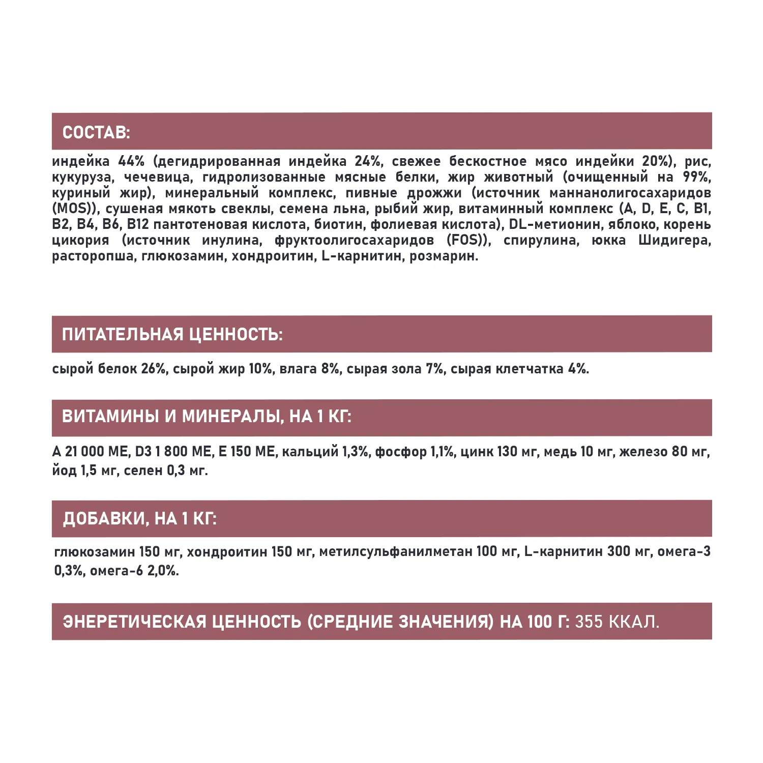 СОСТАВ: индейка 44% (дегидрированная индейка 24%, свежее бескостное мясо индейки 20%), рис, кукуруза, чечевица, гидролизованные мясные белки, жир животный (очищенный на 99%, куриный жир), минеральный комплекс, пивные дрожжи (источник маннанолигосахаридов (MOS)), сушеная мякоть свеклы, семена льна, рыбий жир, витаминный комплекс (A, D, E, C, B1, B2, B4, B6, B12 пантотеновая кислота, биотин, фолиевая кислота), DL-метионин, яблоко, корень цикория (источник инулина, фруктоолигосахаридов (FOS)), спирулина, юкка Шидигера, расторопша, глюкозамин, хондроитин, L-карнитин, розмарин.ПИТАТЕЛЬНАЯ ЦЕННОСТЬ: сырой белок 26%, сырой жир 10%, влага 8%, сырая зола 7%, сырая клетчатка 4%.