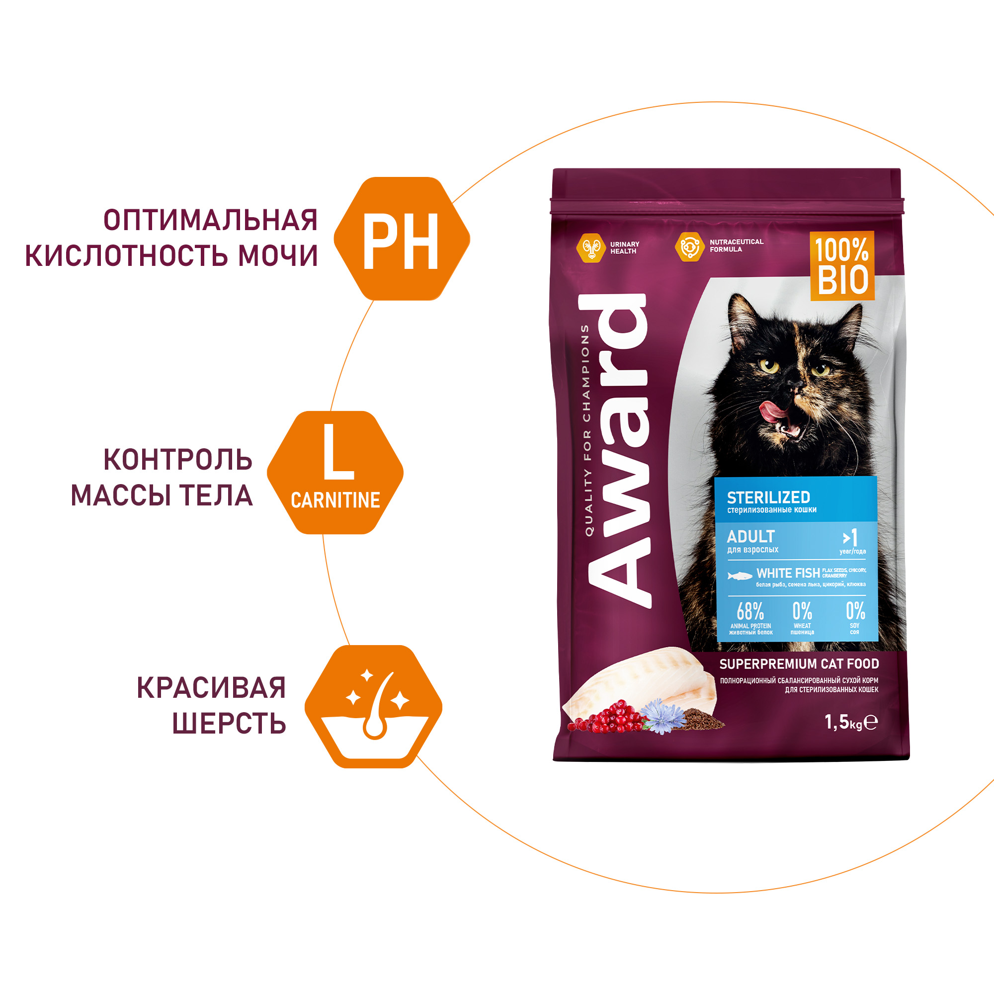 Сухой корм AWARD Sterilized для взрослых стерилизованных кошек с белой рыбой с добавлением семян льна, клюквы и цикория 1,5 кг.