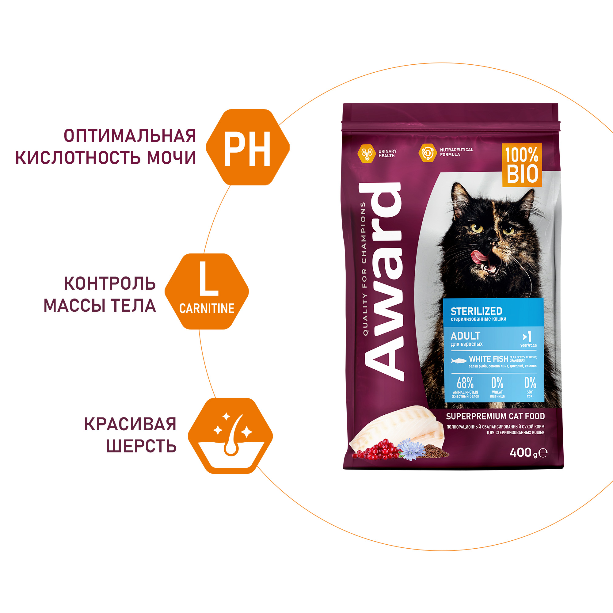 Сухой корм AWARD Sterilized для взрослых стерилизованных кошек с белой рыбой с добавлением семян льна, клюквы и цикория 400 г.