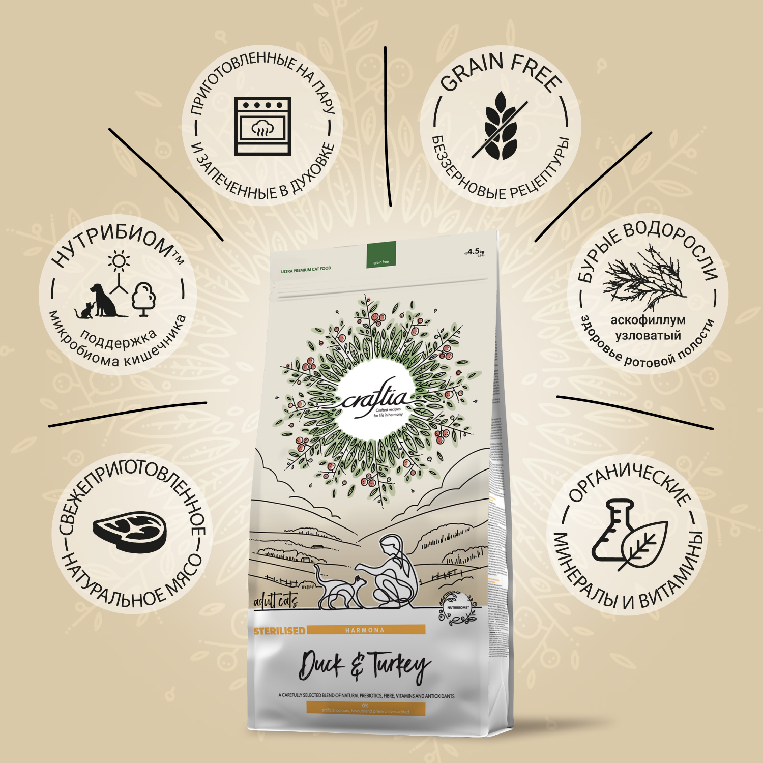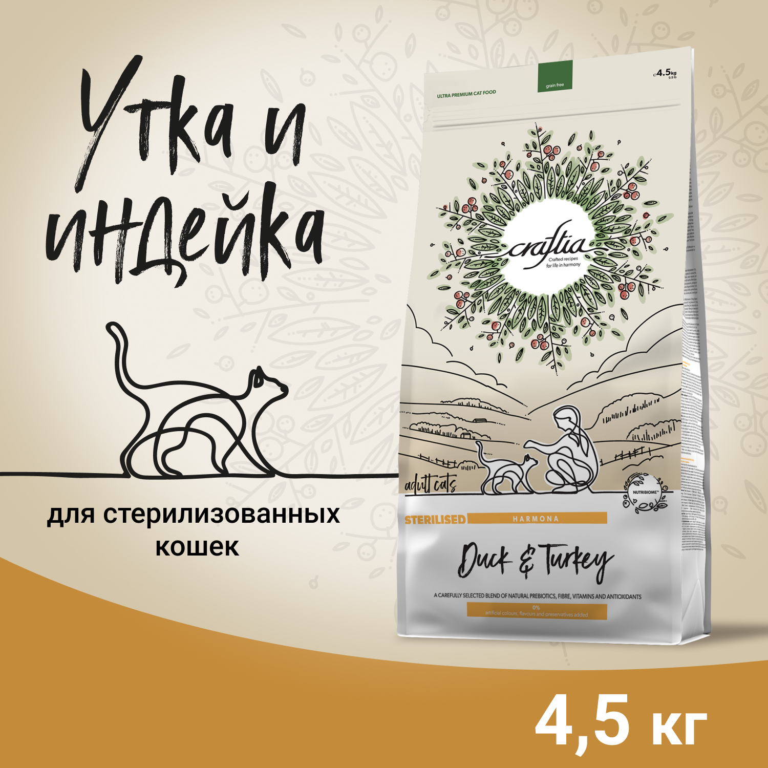 Сухой корм CRAFTIA HARMONA для стерилизованных кошек из утки и индейки 4,5 кг