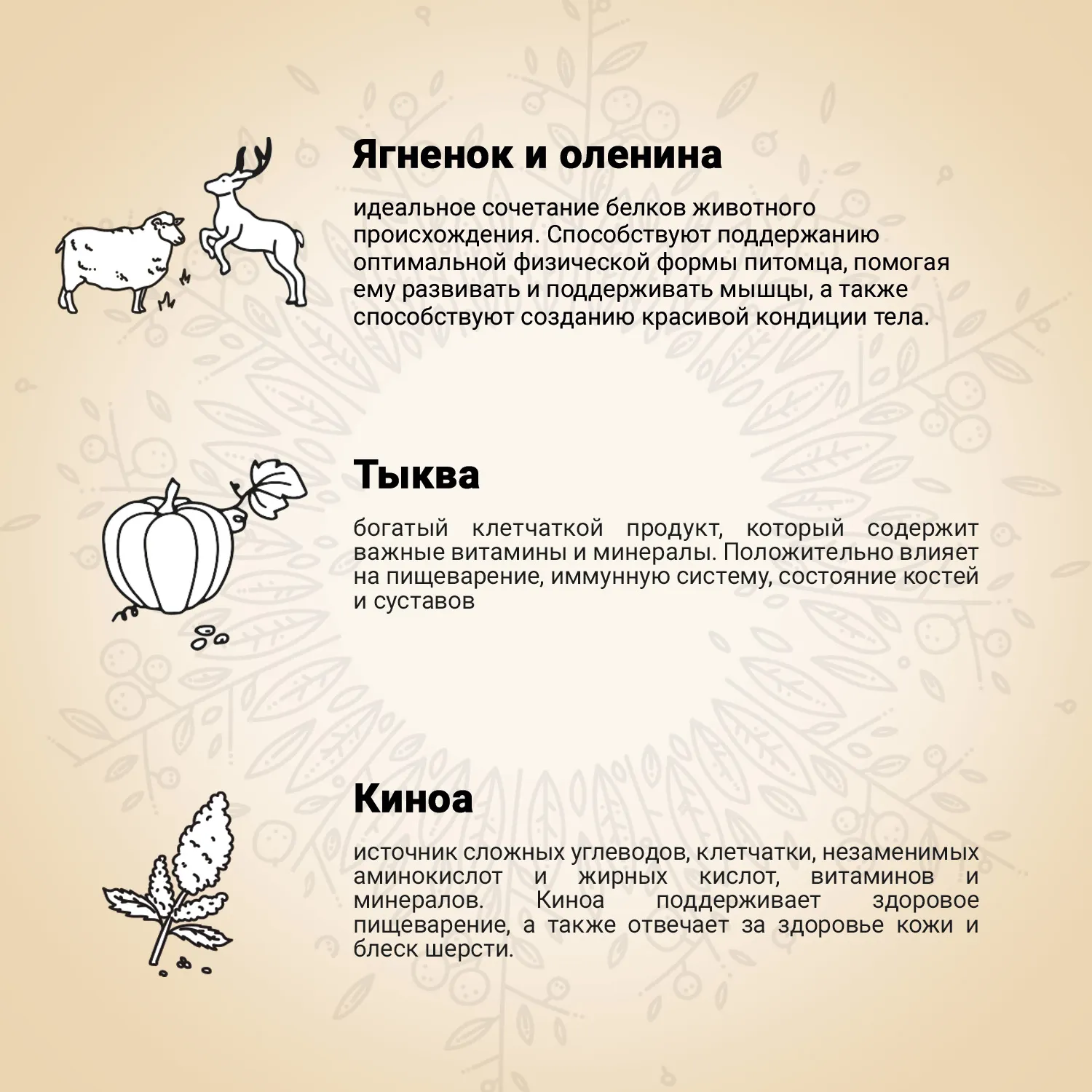 Сырой бескостный ягненок (26%), гороховый крахмал, гидролизованный белок оленины (10%), дегидратированный белок курицы, дегидратированный белок сельди, гидролизованный белок птицы (курица, индейка), куриный жир, экстракт семян киноа (4%), сухая свекольная пульпа, гидролизованный белок рыбы (треска, пикша), рыбий жир (из лосося), куриные потроха (печень, сердце, почки), сухое яйцо (куриное), люцерновая мука, волокна гороха, сушеное яблоко (0,5%), сушеная тыква (0,5%), льняное семя, карбонат кальция, монокальцийфосфат, хлорид калия, инулин цикория (0,4%), дрожжевой экстракт (источник маннанолигосахаридов) (0,3%), фруктоолигосахариды (0,3%), аскофиллум узловатый (Ascophyllum Nodosum), сухие пивные дрожжи, хлорид натрия, сушеная вишня, сушеная черника, сушеная клюква, сушеная спаржа, алоэ вера, розмарин, куркума, календула, шелуха и семена подорожника, юкка Шидигера. Питательные добавки на 1 кг: витамин А 19000 МЕ; витамин D3 1900 МЕ; витамин Е 250 мг; витамин С 190 мг; Ниацинамид 57 мг; D-пантенол 23,7 мг; витамин В2 11,8 мг; витамин В6 7,1 мг; витамин В1 11,8 мг; биотин 0,57 мг; фолиевая кислота 0,57 мг; витамин В12 0,1 мг; холина хлорид 2700 мг; цинк (хелат цинка гидрата глицина): 84,6 мг; марганец (хелат марганца гидрата глицина): 18 мг; железо [хелат железа (II) гидрата глицина]: 64,8 мг; медь [хелат меди (II) гидрата глицина]: 12,6 мг; йод (йодат кальция безводный): 1,8 мг; селен (L-селенометионин): 0,3 мг; DL-метионин, технически чистый 5000 мг; таурин 2180 мг; L-карнитин 200 мг. Антиоксиданты: экстракты токоферола из растительных масел. Технологические добавки: микрокристаллическая целлюлоза. Питательная ценность: сырой белок 39,8%; сырой жир 11%; сырая клетчатка 5,1%; сырая зола 8%; кальций 1,2%; фосфор 0,9%; Омега-6 жирные кислоты - 1,8%; Омега-3 жирные кислоты - 0,5%; докозагексаеновая кислота (ДГК) - 0,25%; эйкозапентаеновая кислота (ЕПК) - 0,20%.Ингредиенты
